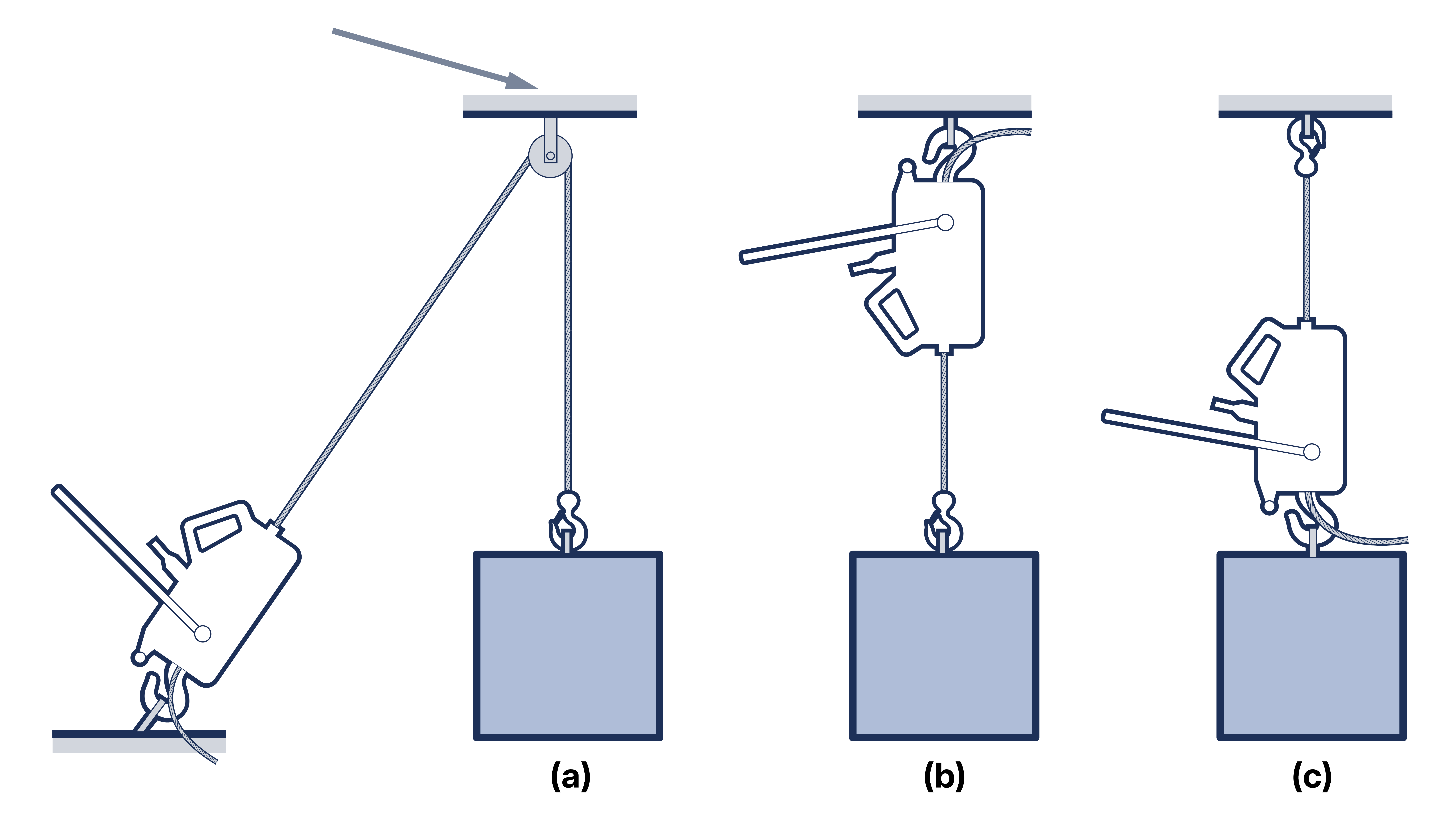 Figure 5.8.1-1 (a) shows the machine anchored close to the ground with the rope taken over a pulley block fixed directly above the load. Additional pulley blocks may be introduced as required to increase the capacity of the system. This method has the advantage that the operative can stand well away from the load but also has the disadvantage that the load imposed on the overhead anchorage is greater than the load lifted. Figure 5.8.1-1 (b) shows the machine anchored directly to the overhead structure so that the load is lifted towards the machine. One or more pulley blocks can be introduced into the system in a similar manner to that shown in Figure 5.8.1-1 (a). Figure 5.8.1-1 (c) shows the machine anchored directly to the load so that the rope remains static and the machine and load climb the rope.