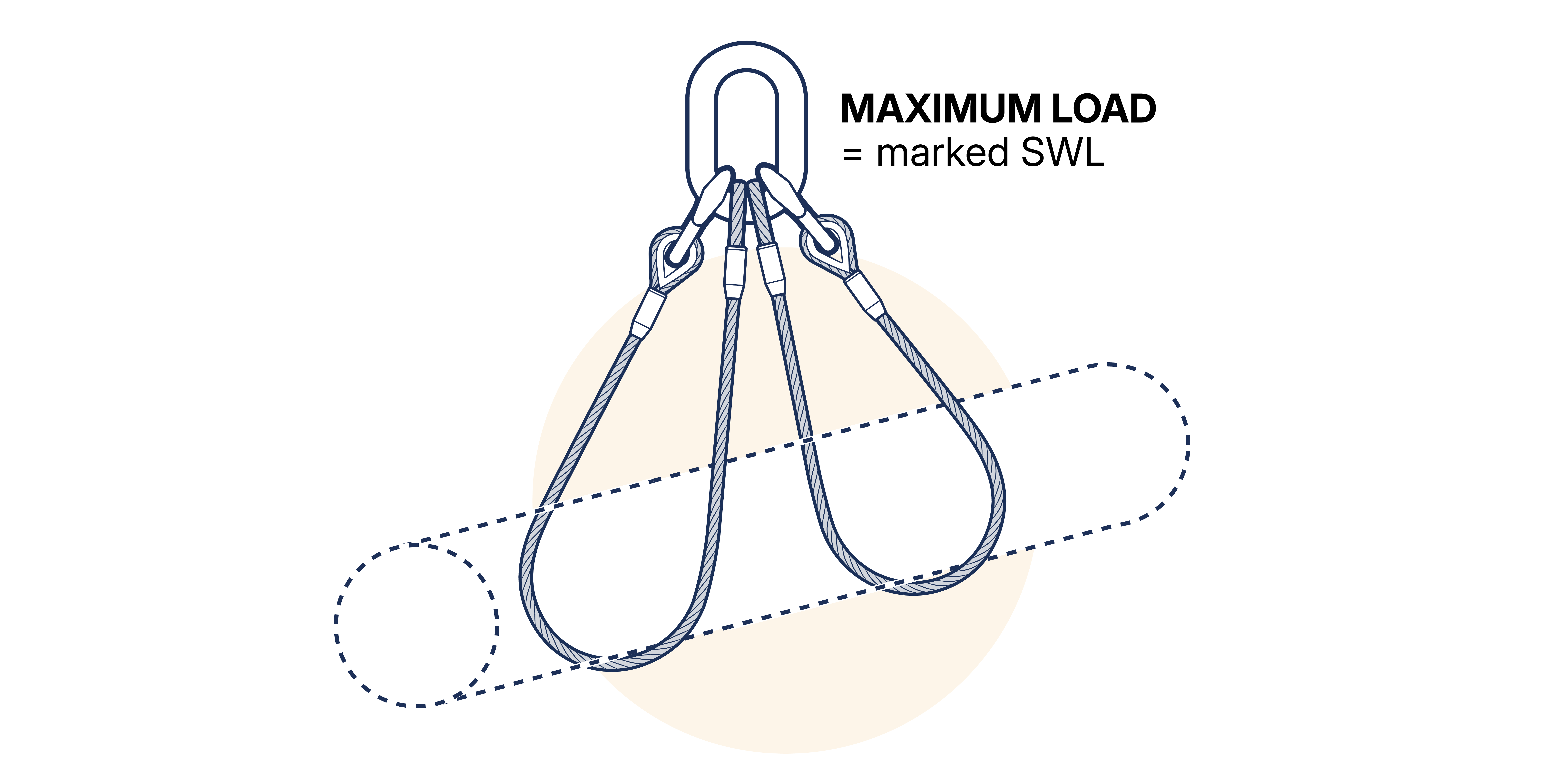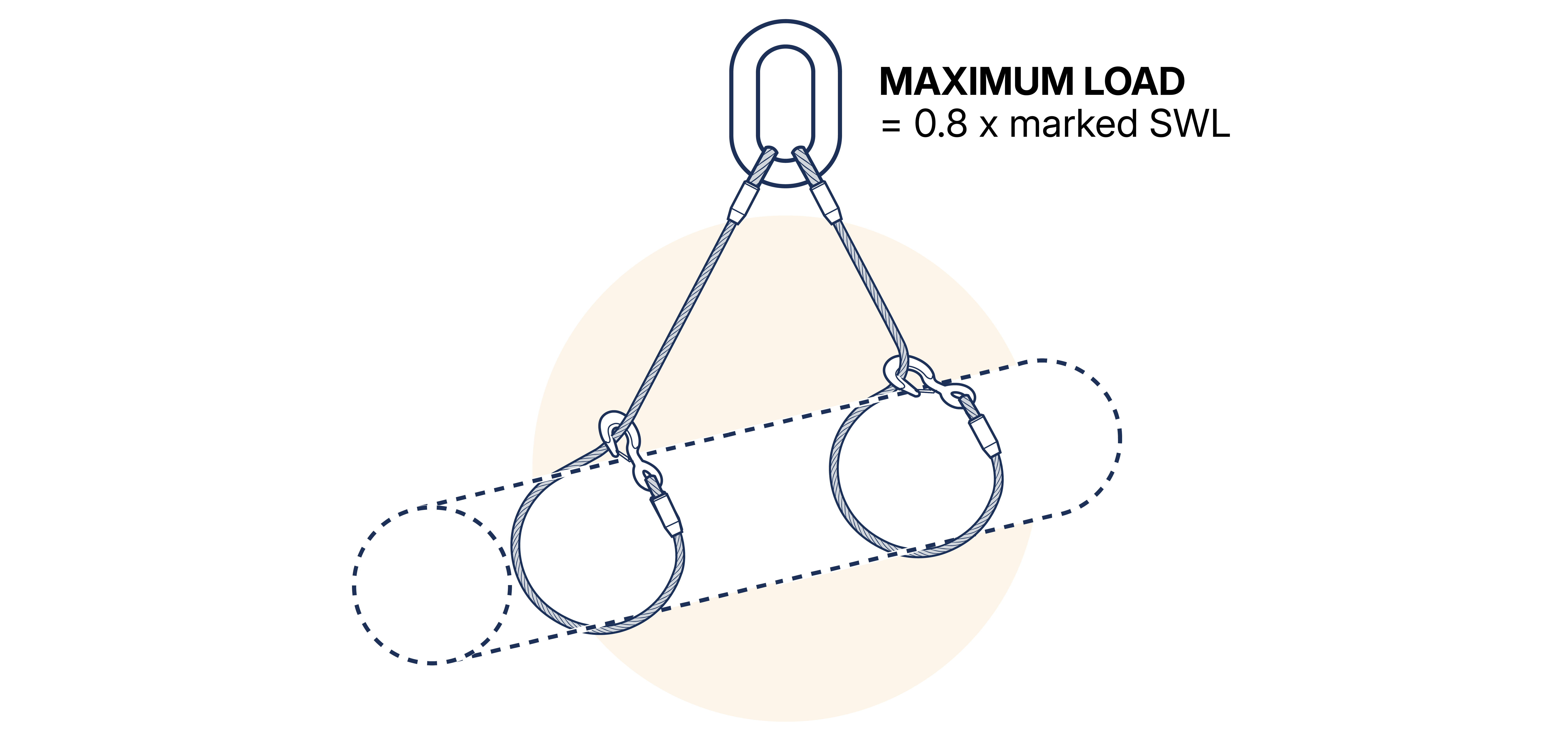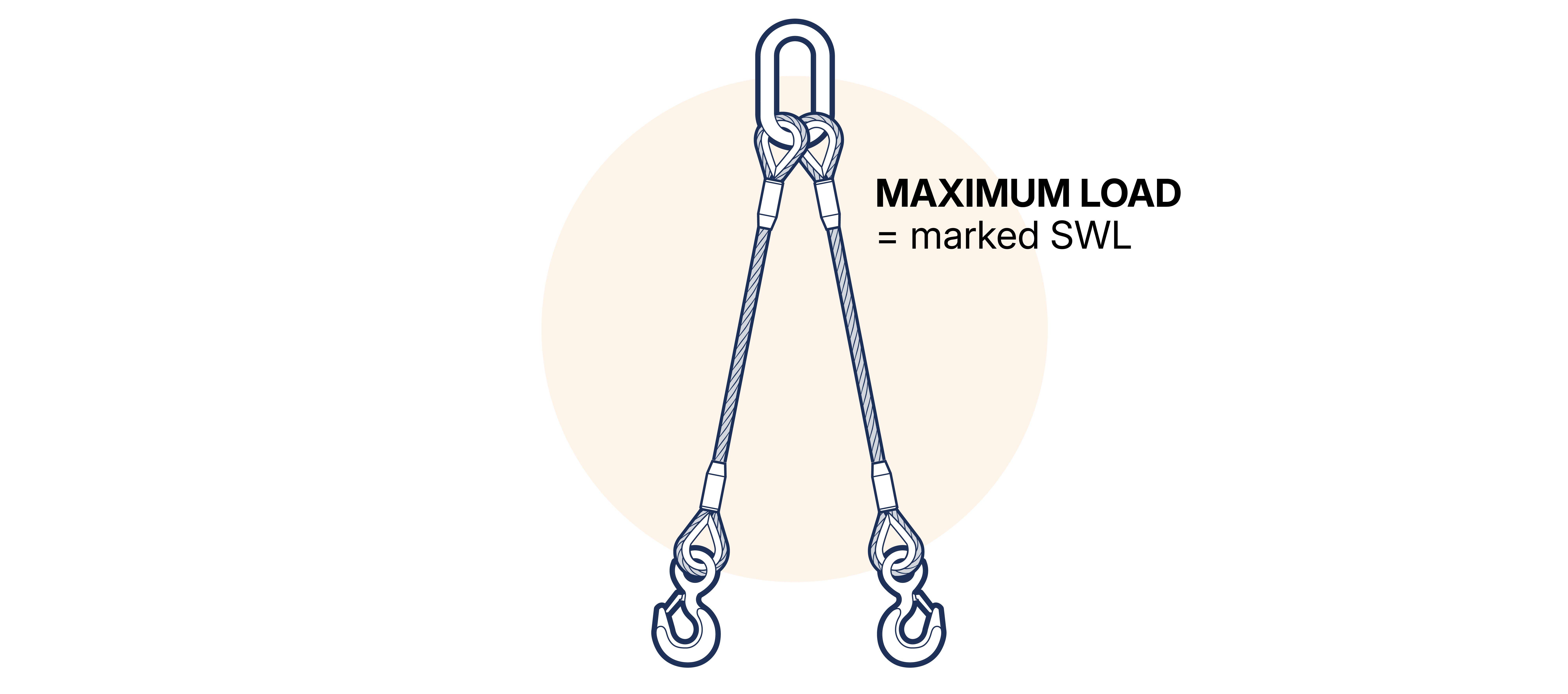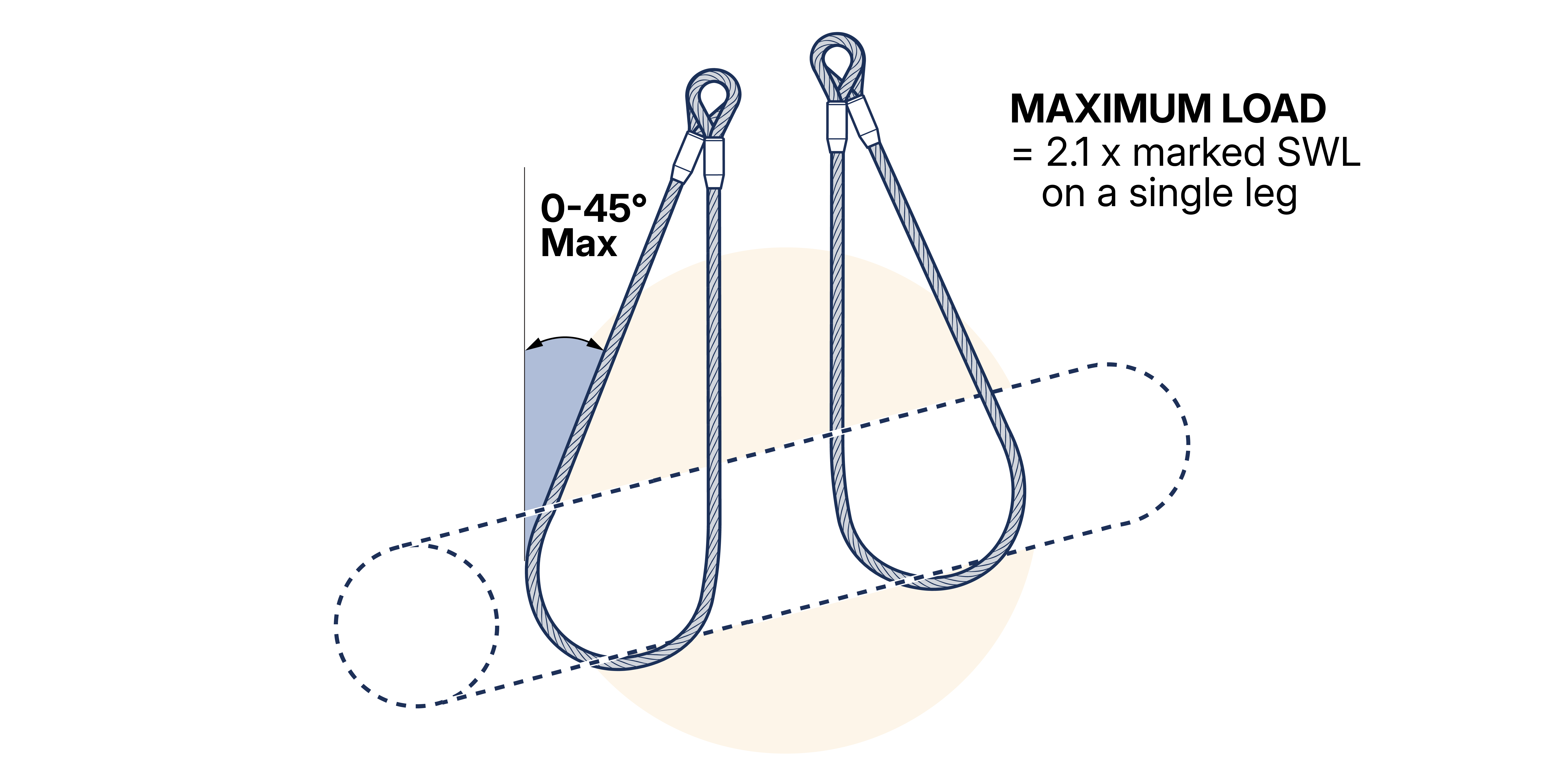 When two single leg slings, of the same length and SWL, are used in basket hitch with the ends of the slings connected to the hook by suitable shackles, the maximum load to be lifted must not exceed 2.1 x the SWL marked on a single sling when the legs are inclined at angles between 0-45° to the vertical (included angle between any two parts of rope is in the range 0-90°). No attempt should be made to use two single slings at an included angle greater than 90°. (See Figure 15.5.2.6-2 )