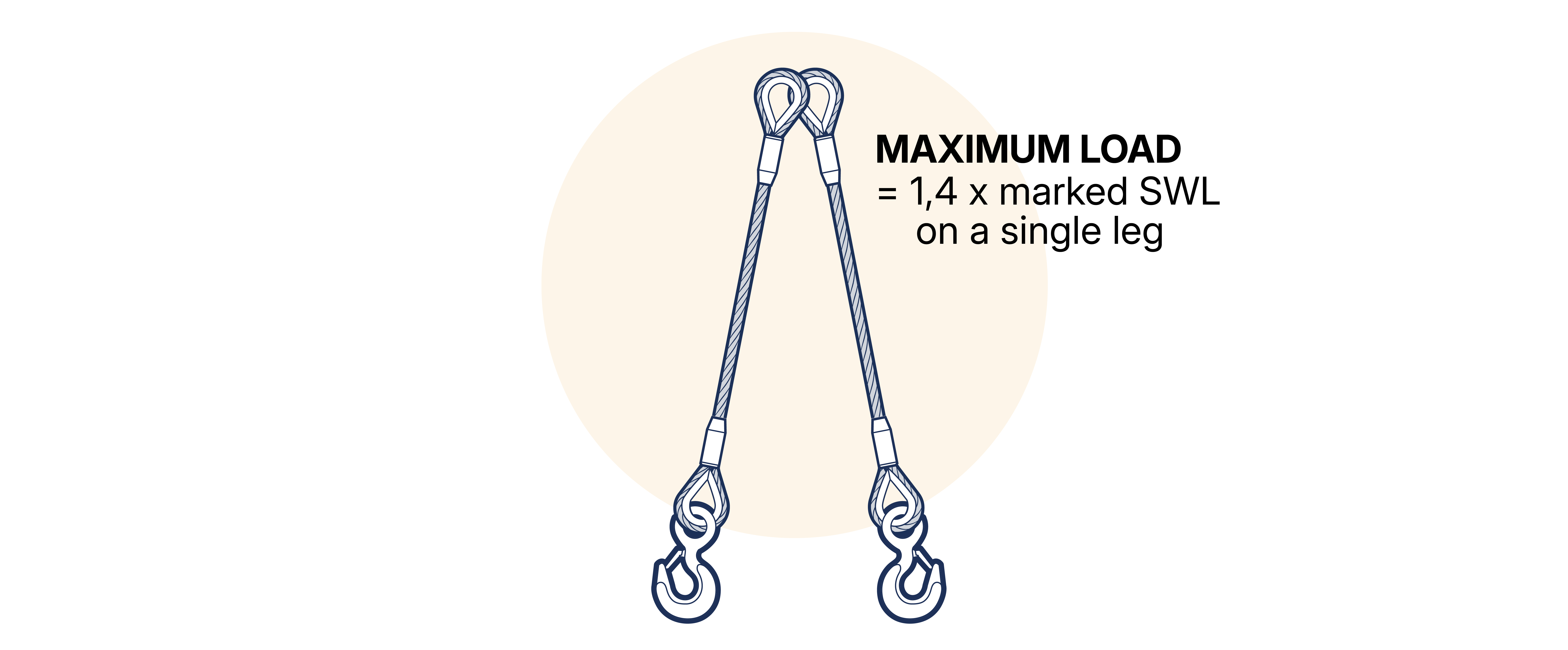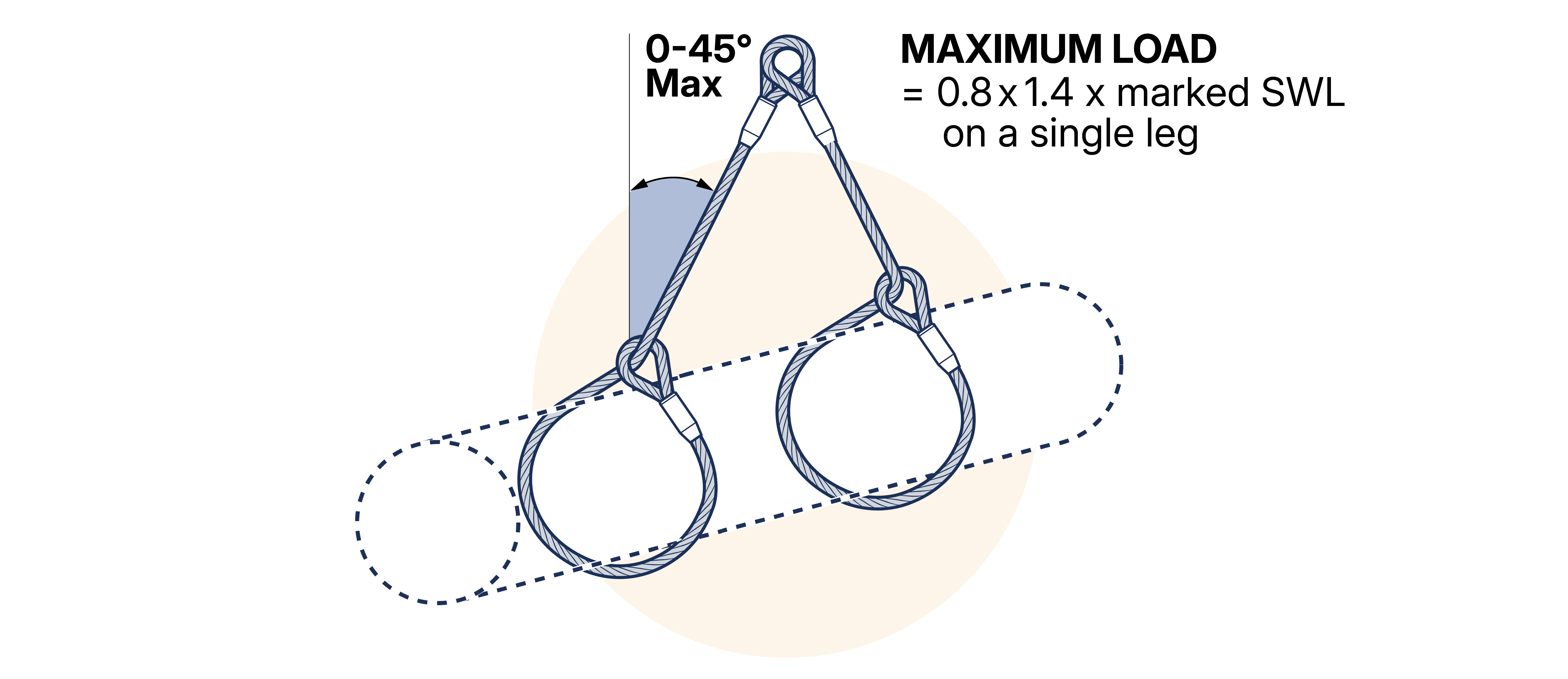 When two single leg slings, of the same length and SWL, are used for a straight lift, the maximum load to be lifted must not exceed 1.4 x the SWL marked on a single sling when the legs are inclined at angles between 0-45° to the vertical (included angle between the legs is in the range 0-90°). The use of two single slings at angles to the vertical greater than 45° (included angle greater than 90°) is not recommended. (See Figure 15.5.2.4-2 )