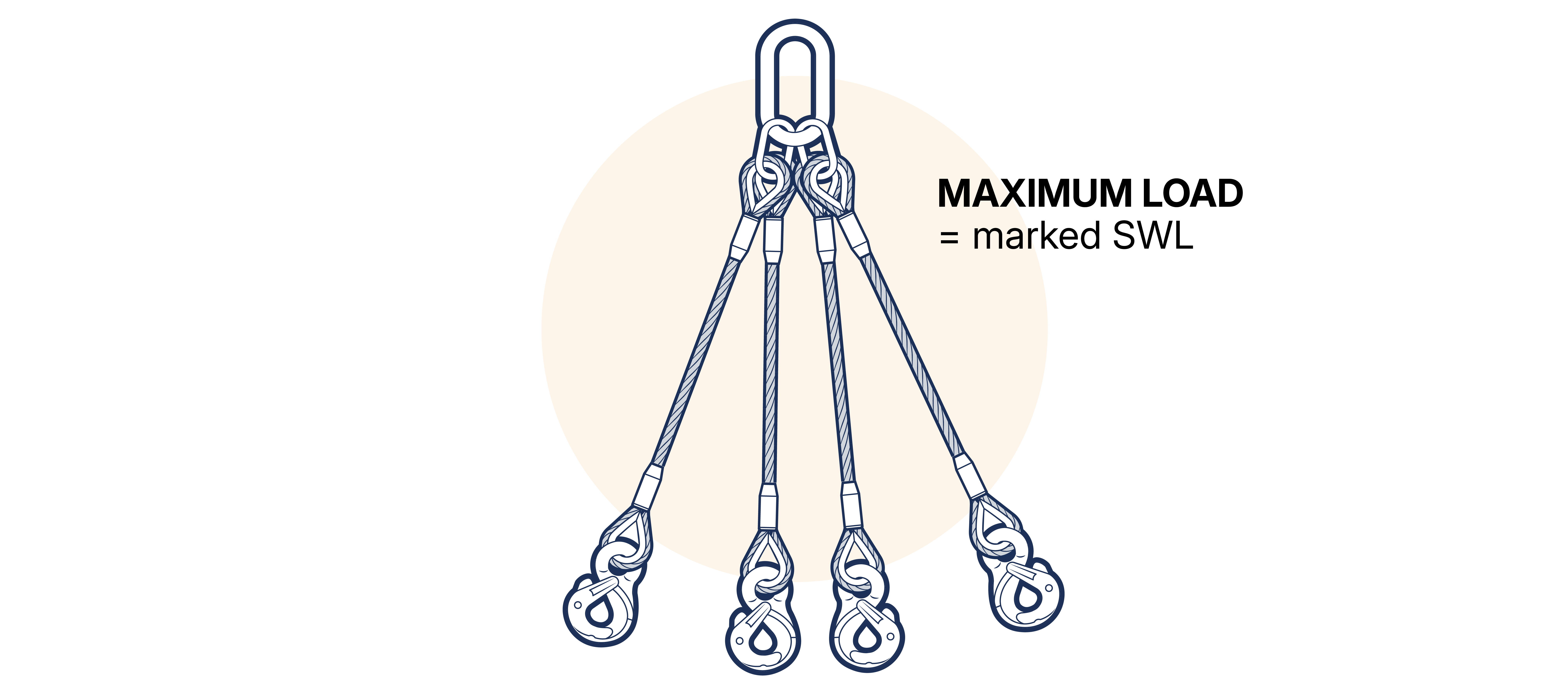 The use of four leg slings in either choke or basket hitch is uncommon and if used in these modes, care must be taken to ensure that all legs are carrying an equal share of the load. Subject to this consideration, the load to be lifted in basket hitch must not exceed the SWL marked on the sling for the appropriate range of angles. When a four leg sling is used in choke hitch, the maximum load to be lifted must not exceed 0.8 x the SWL marked on the sling for the appropriate range of angles. The ‘included angle’ should be taken as twice the angle to the vertical of any part of any leg.