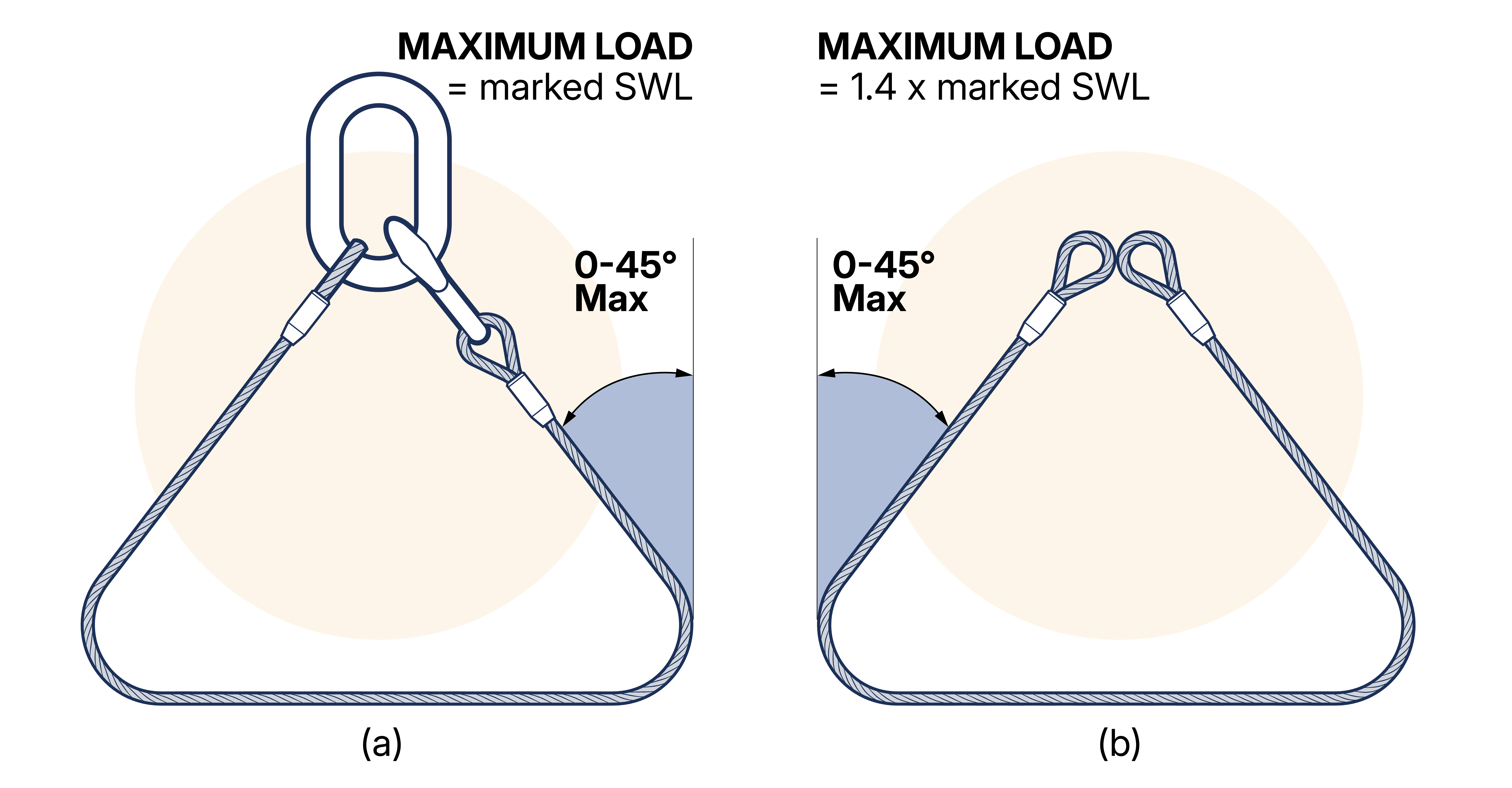 When a single leg sling is used in basket hitch with both ends onto the hook, or connected by a suitable shackle, and with the parts of rope disposed at angles between 0-45° to the vertical (disposed at an included angle of 0-90°), the maximum load to be lifted must not exceed 1.4 x the SWL marked on the sling. (See Figure 15.5.2.3-1 b)