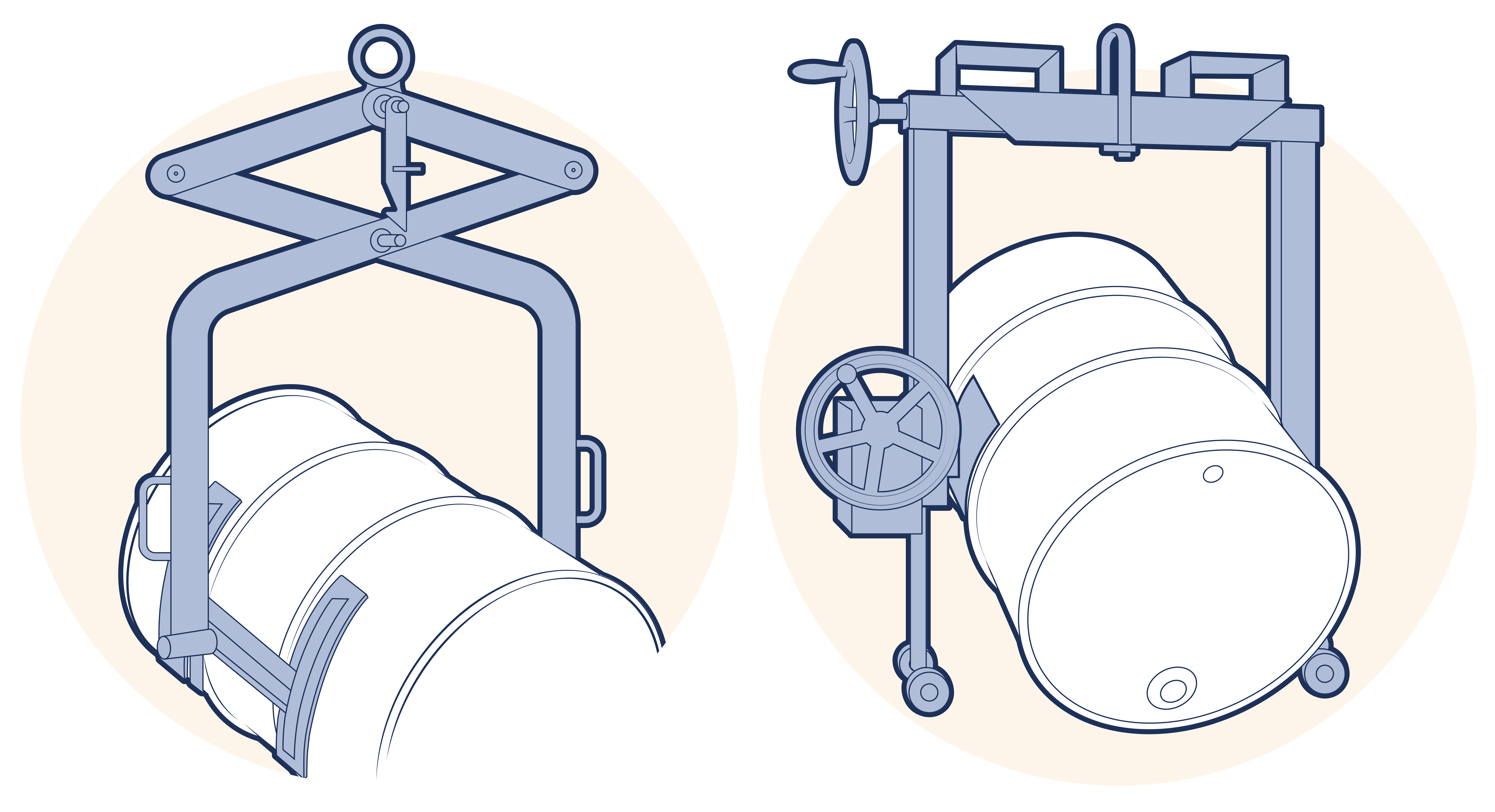 This type of lifter grips the side of the barrel and allows rotation of the barrel about its vertical axis utilising the swivel in the hook of the lifting machine and, if fitted with the appropriate mechanism, also facilitates tilting of the barrel or rotation about its horizontal axis.