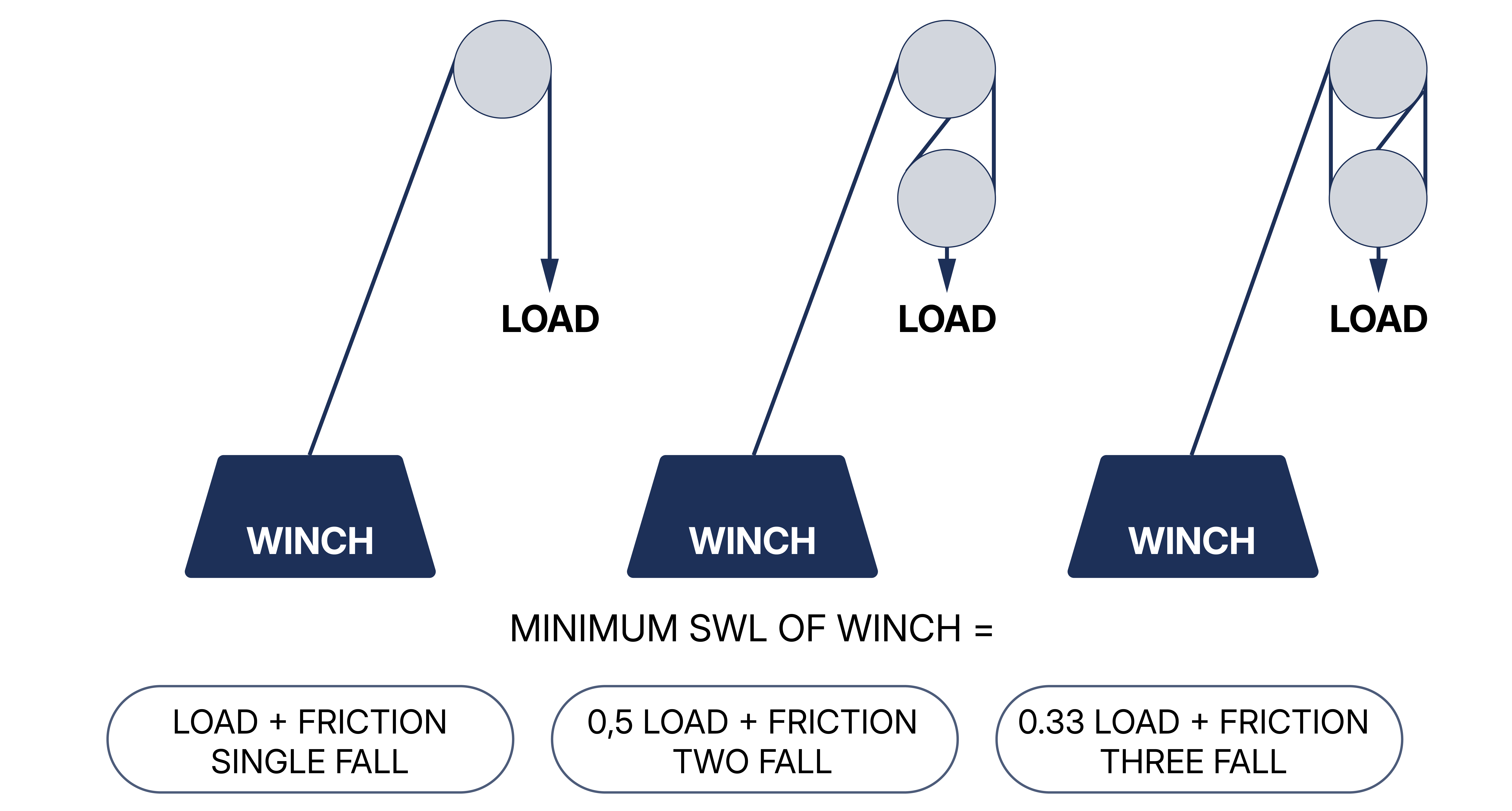The capacity of the winch to be selected will depend on the maximum load to be lifted and the rigging method to be employed. If the rigging arrangement calls for a single fall of rope, then the SWL of the winch must be at least equal to the maximum load to be lifted. However, if the rigging arrangement utilizes multiple sheaves or blocks, the load will be proportionally shared between the falls of rope. For example, if there are two falls of rope, the load in the rope will be half the total load to be lifted; if there are three falls of rope the load in the rope will be one third the total load to be lifted and so on. (See Figure 7.5.2-1 ) In such cases, the SWL of the winch should be at least equal to the load in the rope plus an allowance for the effects of friction. Although the effects of friction will vary, dependent on the type of sheave and bearings, it is normal to assume that this will be 8% per sheave.