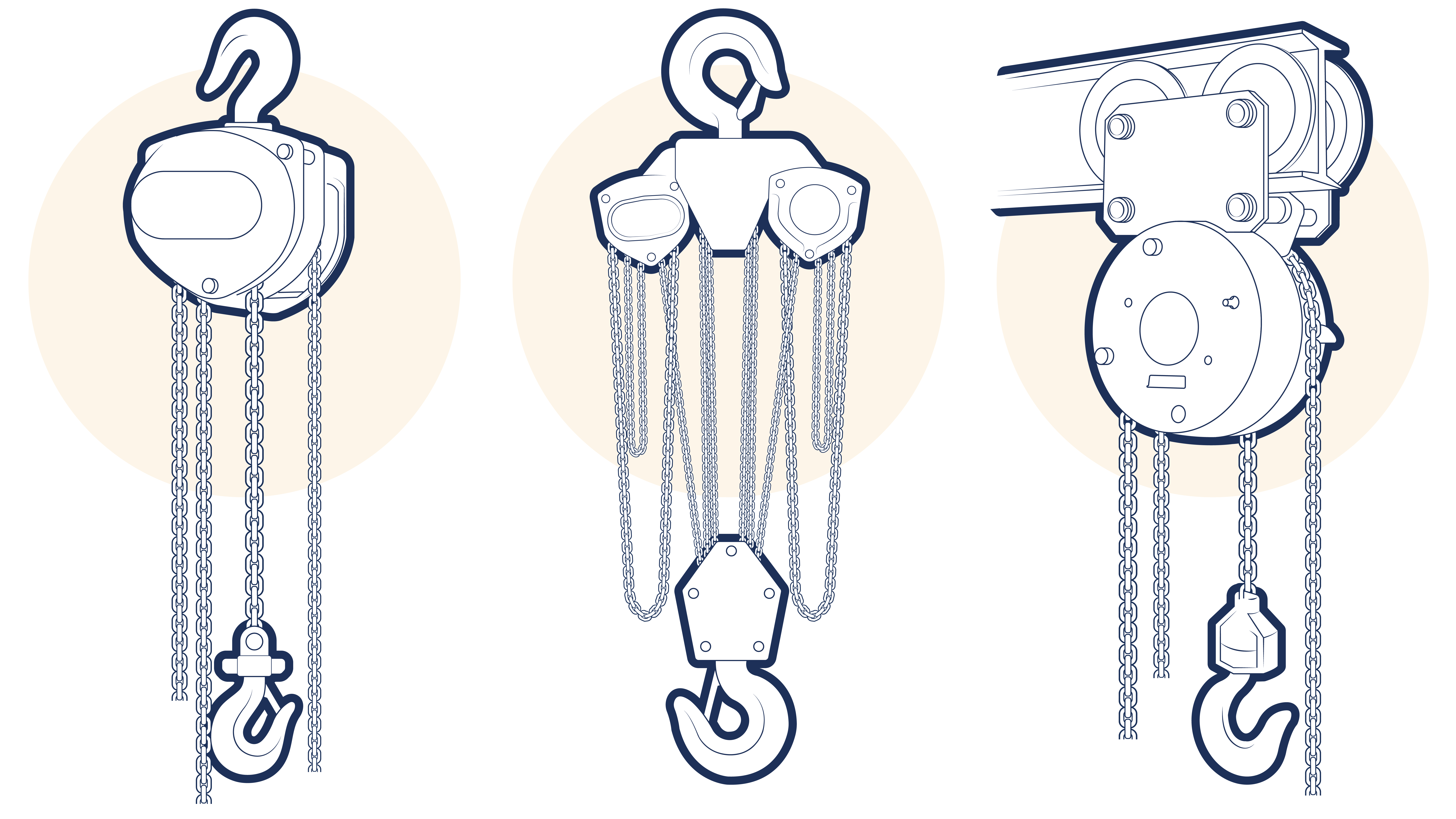 The hoist may be of ‘suspended’ or ‘combined’ unit, many manufacturers producing both options. Suspended types have a top hook, shackle, eyebolt or other fitting by which the hoist is hung and which allows a degree of articulation between the hoist and the supporting structure. (See Figure 3.4.1-1 a) Combined types are usually combined with a purpose made travelling trolley, although a direct connection to the supporting structure may also be possible. (See Figure 3.4.1-1 c) The connection between the hoist and the trolley or structure is usually rigid.
