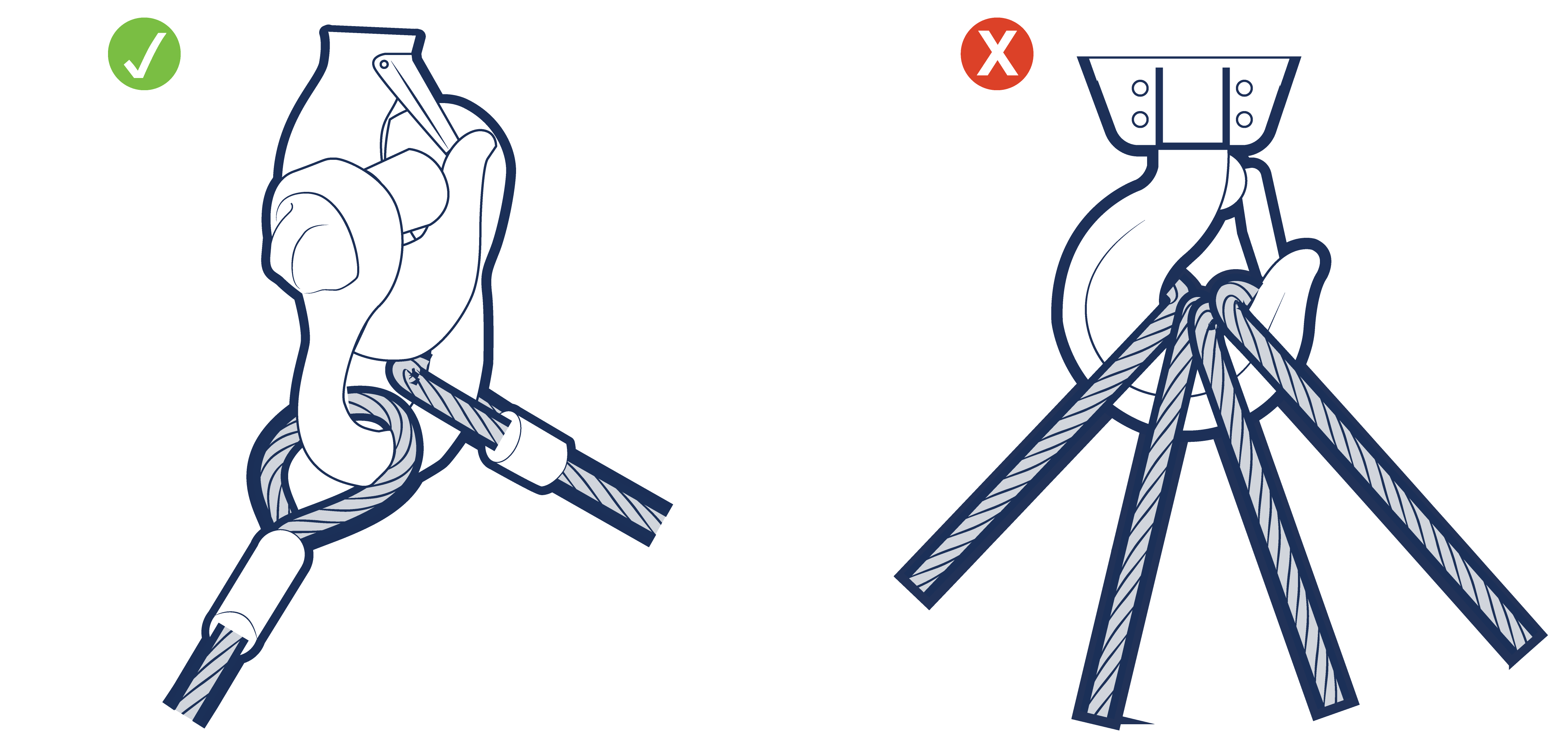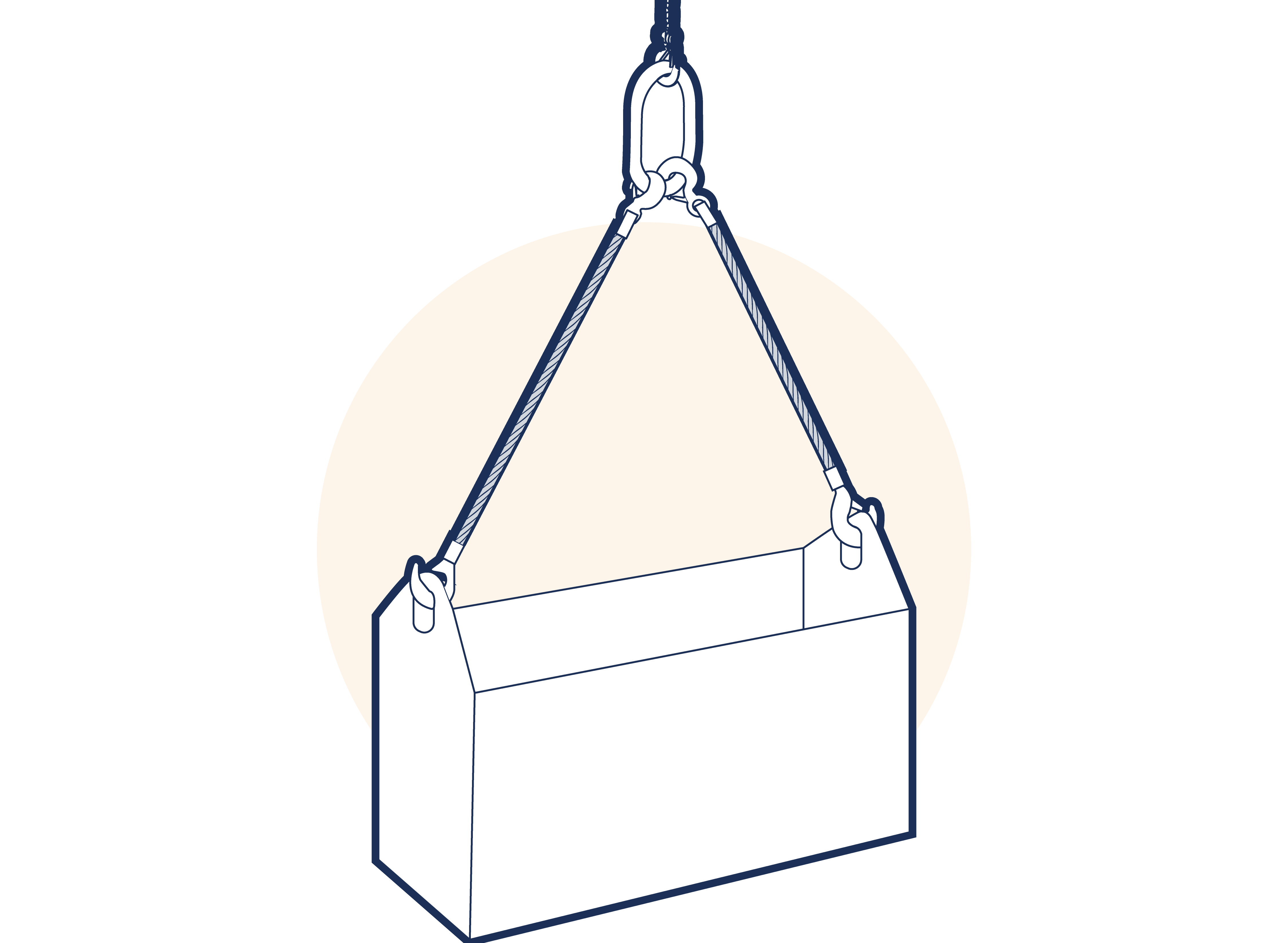 The method of attaching the slings to the crane hook should ensure that the sling eyes or links are not damaged. Two single leg slings used as a two leg sling must be treated as a two leg sling for rating purposes. The combined SWL when the legs are at an angle between 0 and 45° to the vertical (0 to 90° included angle) is 1.4 times the SWL of the single leg.