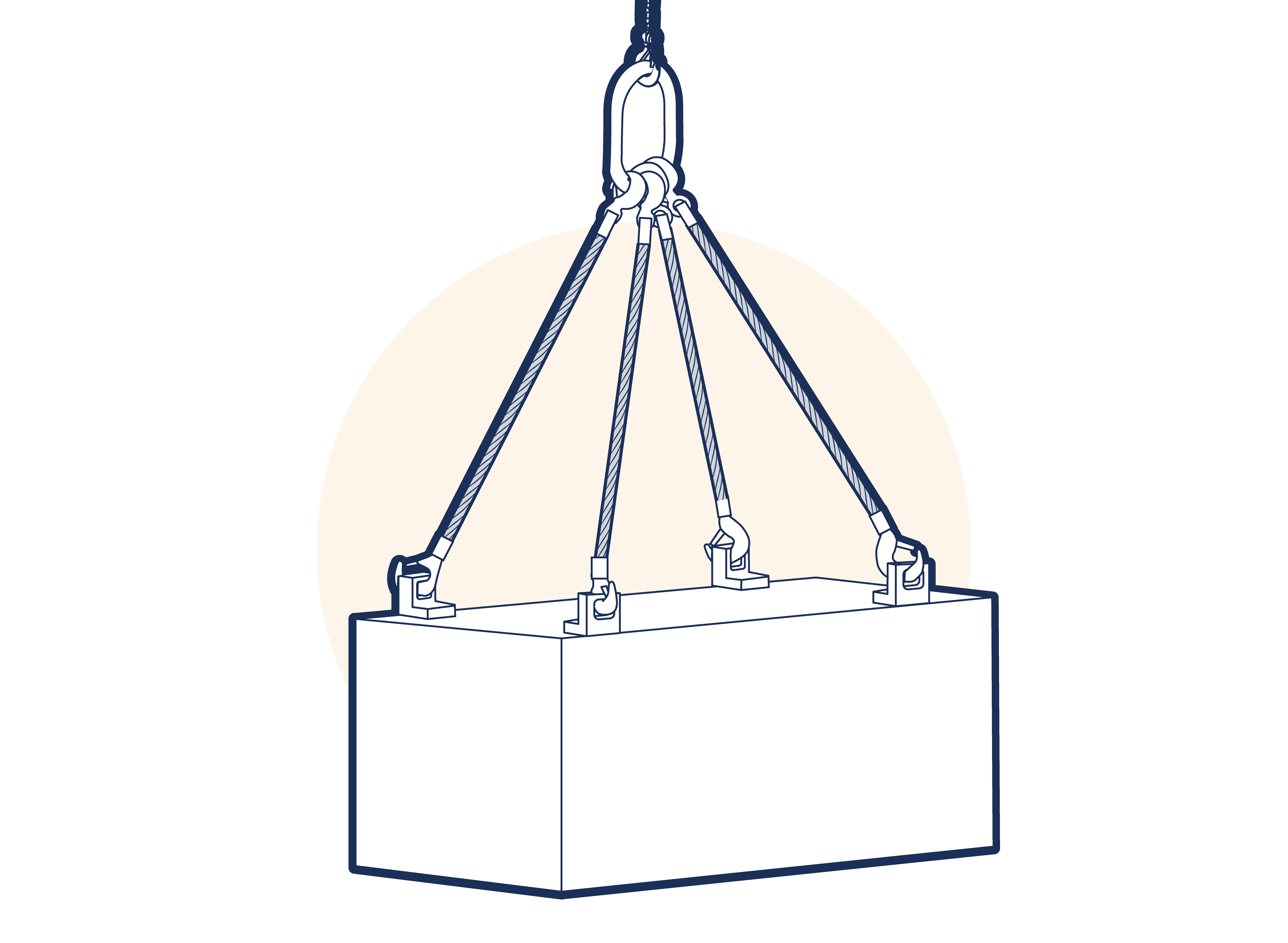 A four leg sling comprises four legs permanently connected at their upper ends by a suitable link assembly and marked as an assembly. Four leg slings are mainly used to handle square or rectangular (four cornered) loads. (SeeFigure 1.A5.4.2.4-1 )