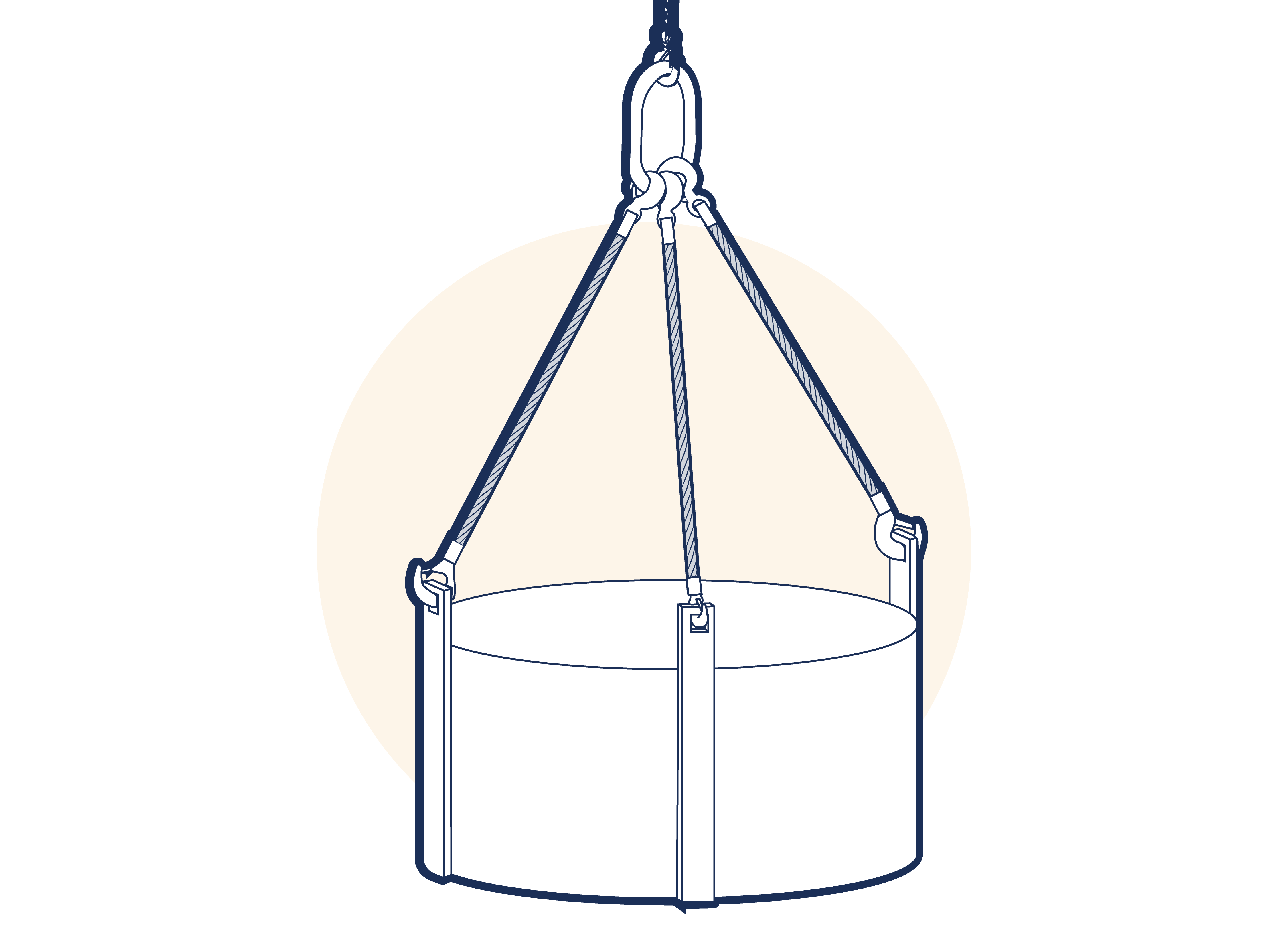 A three leg sling comprises three legs permanently connected at their upper ends by a suitable link assembly and marked as an assembly. Three leg slings are commonly used to handle circular or irregularly shaped loads where the legs can be equally spaced. (See Figure 1.A5.4.2.3-1 )