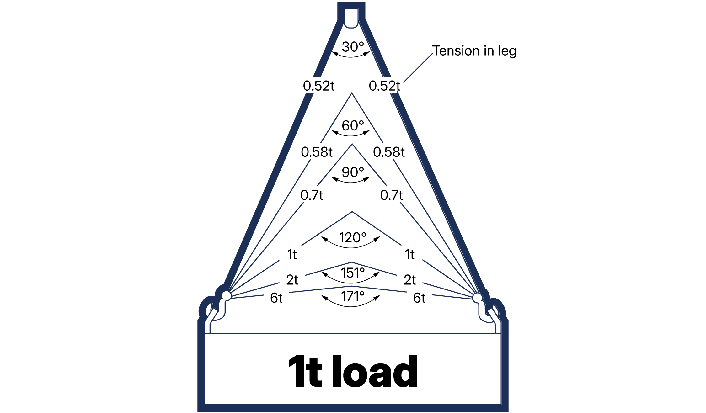 Two leg sling 45°-60° (included angle 90° -120°) = 1.0 x WLL of a single leg