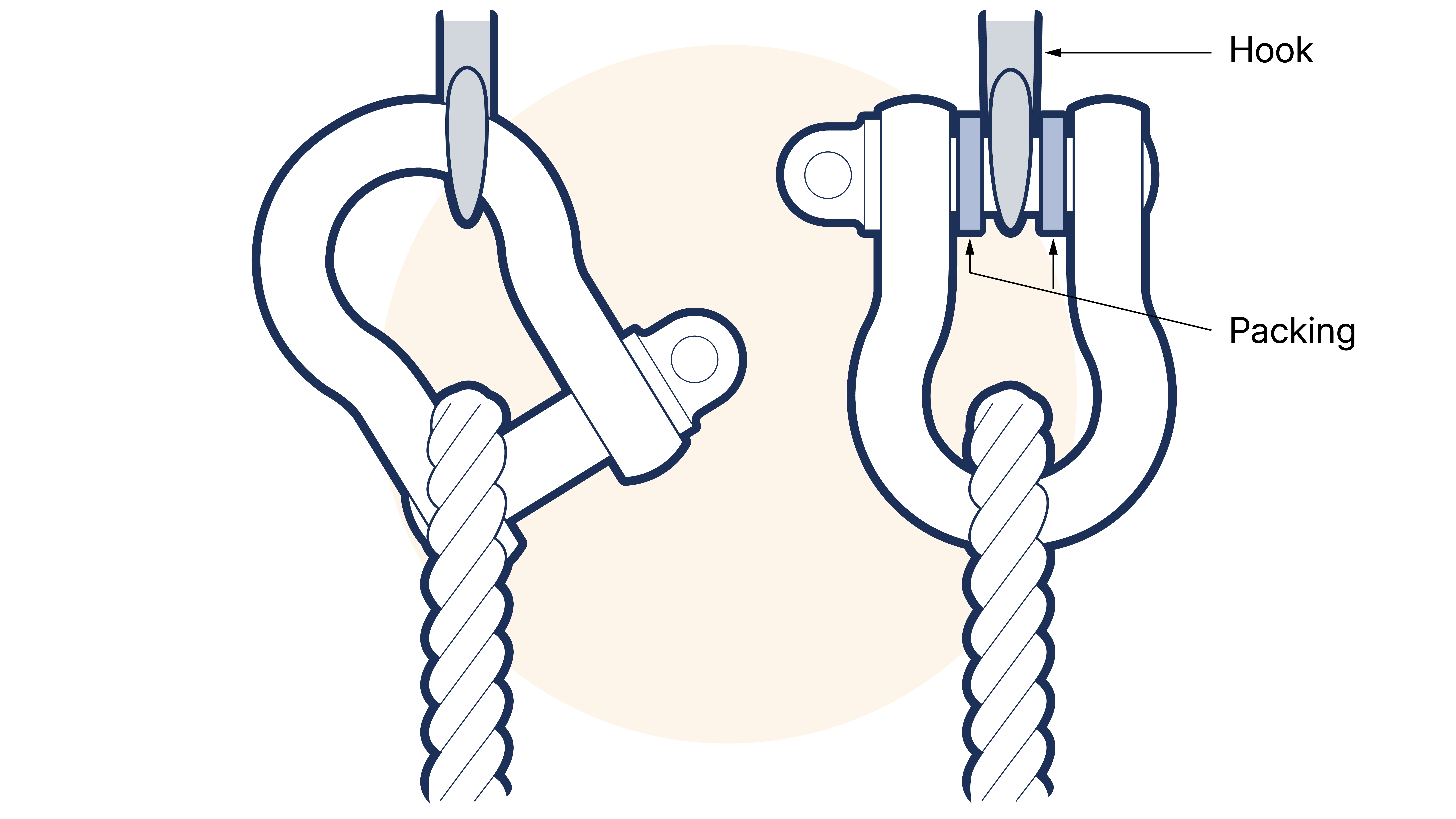 To avoid eccentric loading of the shackle, a loose spacer may be used on either end of the shackle pin (See Figure 19.10-3 ) or a shackle with a smaller jaw width should be used. Do not reduce the width between the shackle jaws by welding washers or spacers to the inside faces of the eyes or by closing the jaws, as this will have an adverse effect on the properties of the shackle. Narrow jaw shackles can normally be obtained from a LEEA member if required.