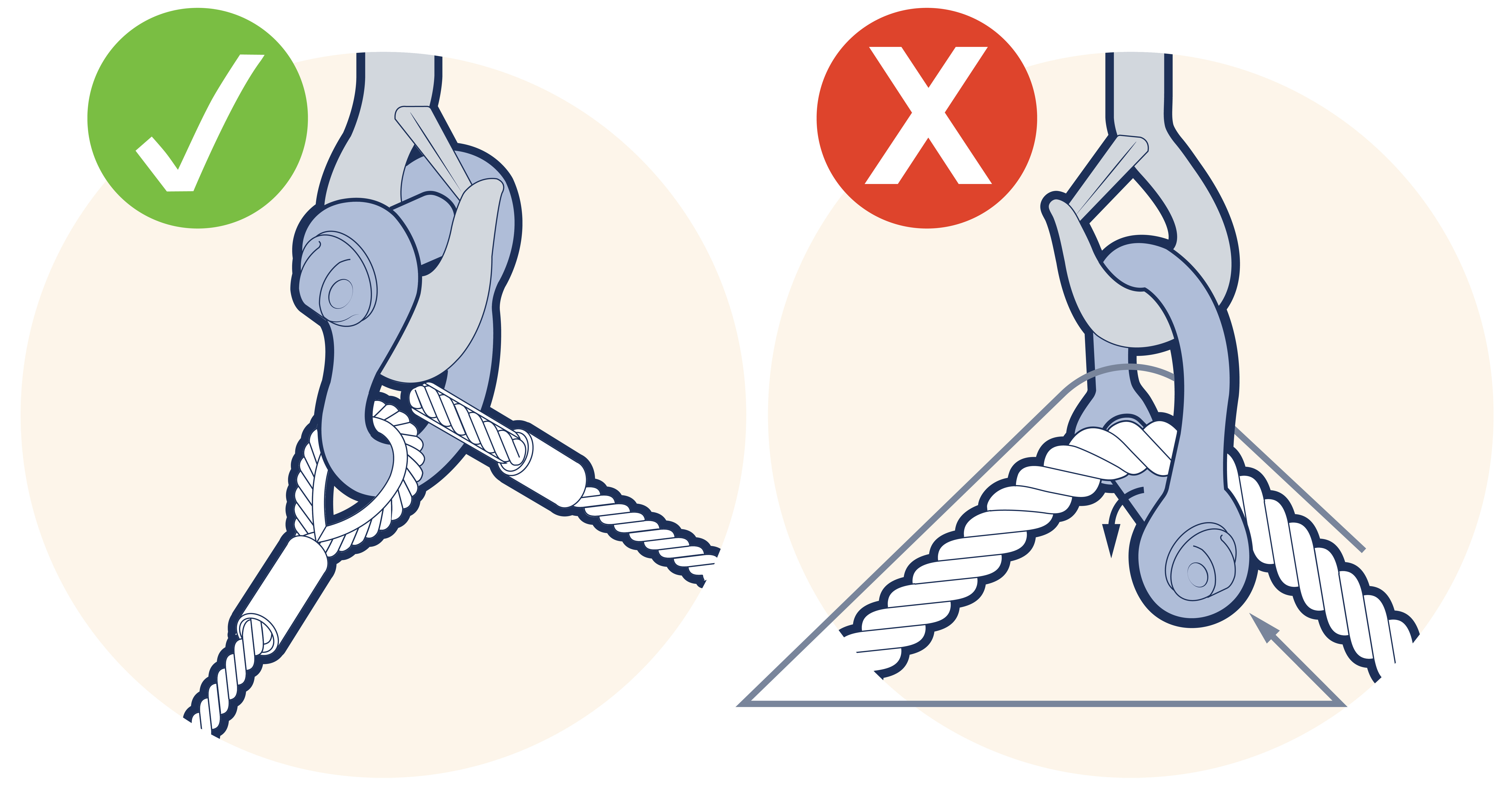 Figure 19.10-4 Correct - shackle pin cannot turn. Incorrect - shackle pin bearing on running line can work loose.