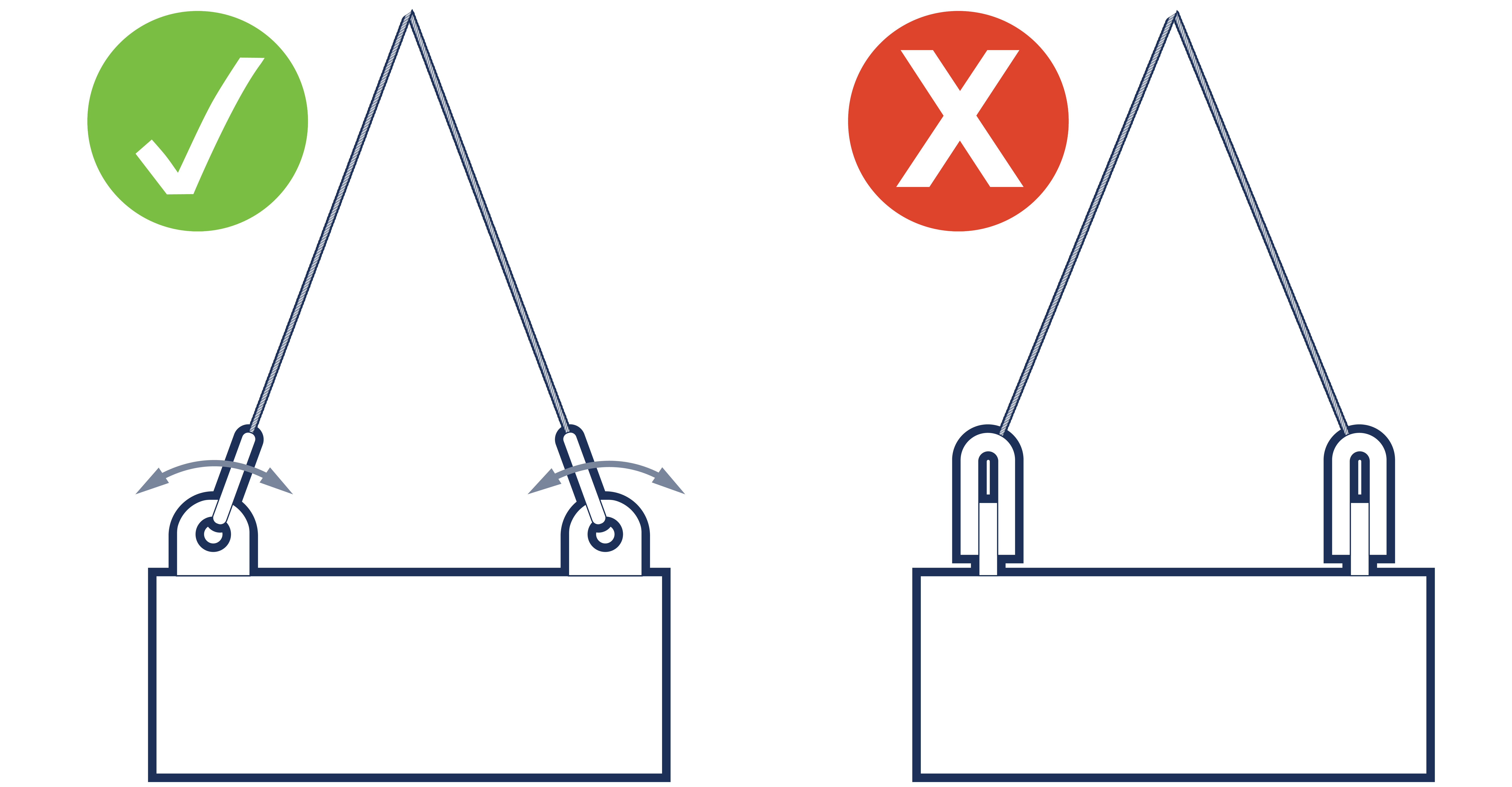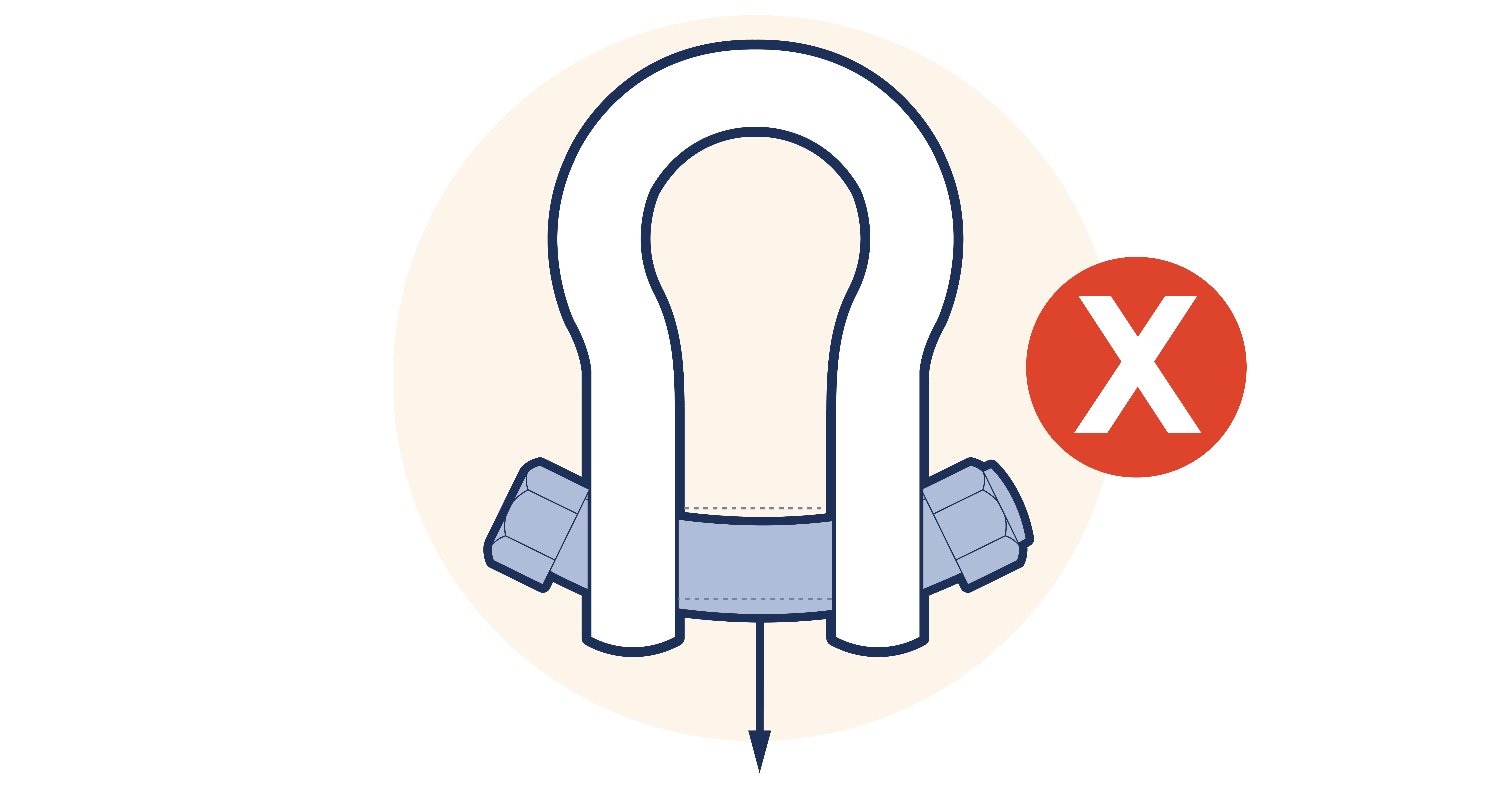 Shackles should be fitted to the load in a manner that allows the shackle body to take the load in a true line along its centre line; and not in such a way that bending loads are induced, other than those for which the shackle is designed. (See Figure 1) When using shackles in conjunction with multi-leg slings, due consideration must be given to the effect of the angle at which the legs of the sling are disposed to the vertical. As the angle increases, so does the load in the sling leg and consequently in any shackle attached to that leg.