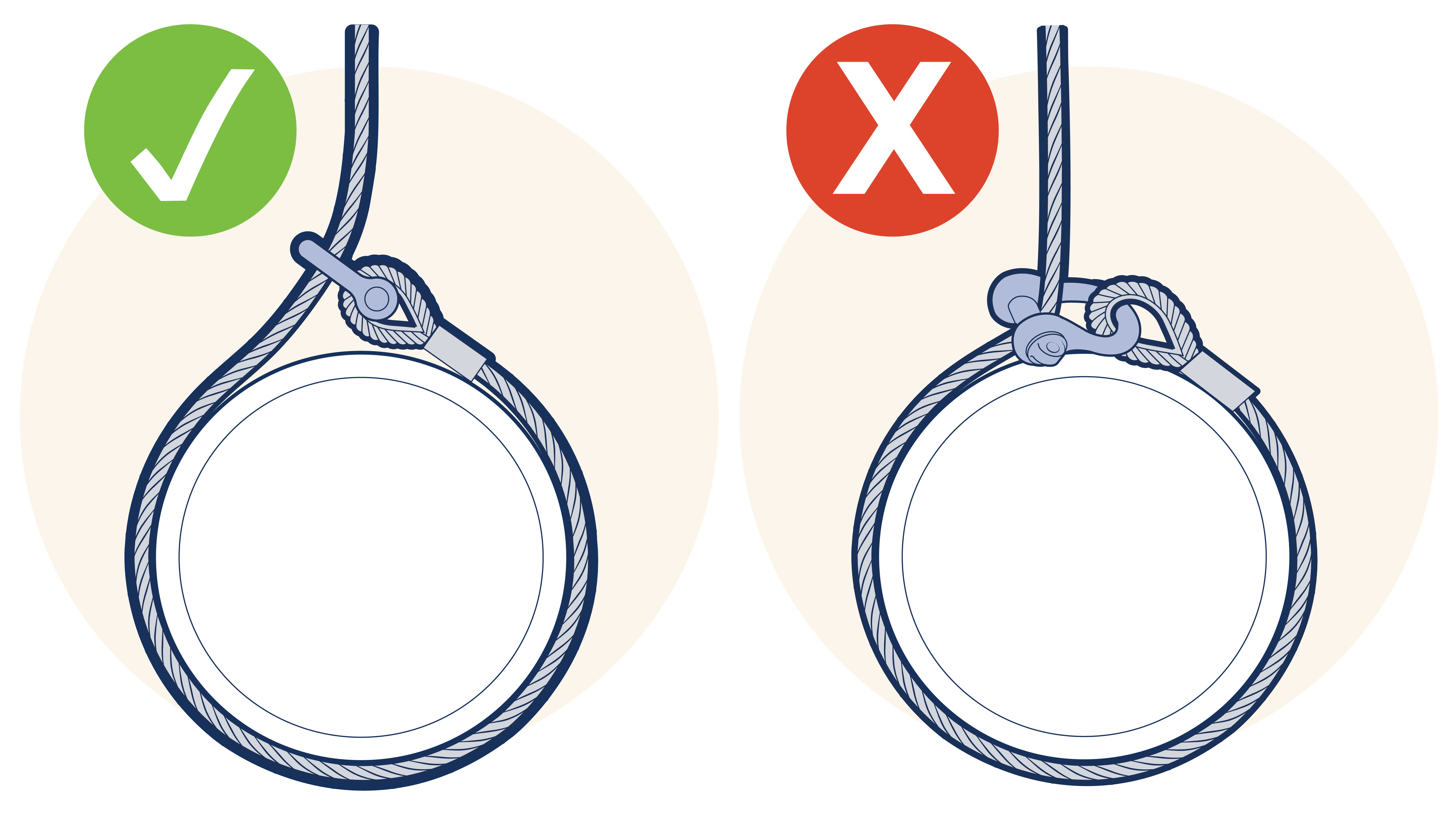 Figure 19.10-5 Correct - use two ropes with eyes. Incorrect - if the load shifts, the sling will unscrew the shackle pin.