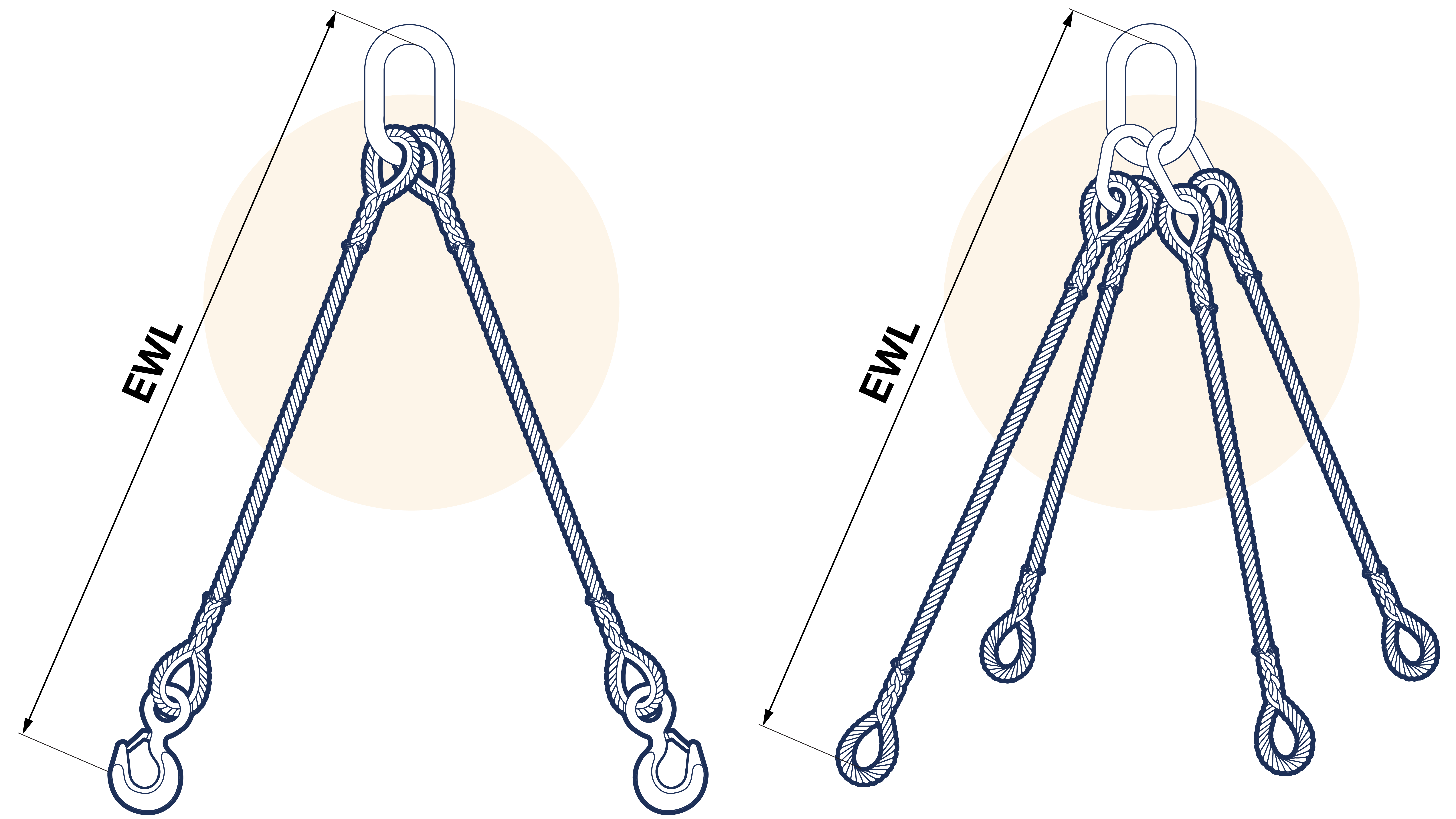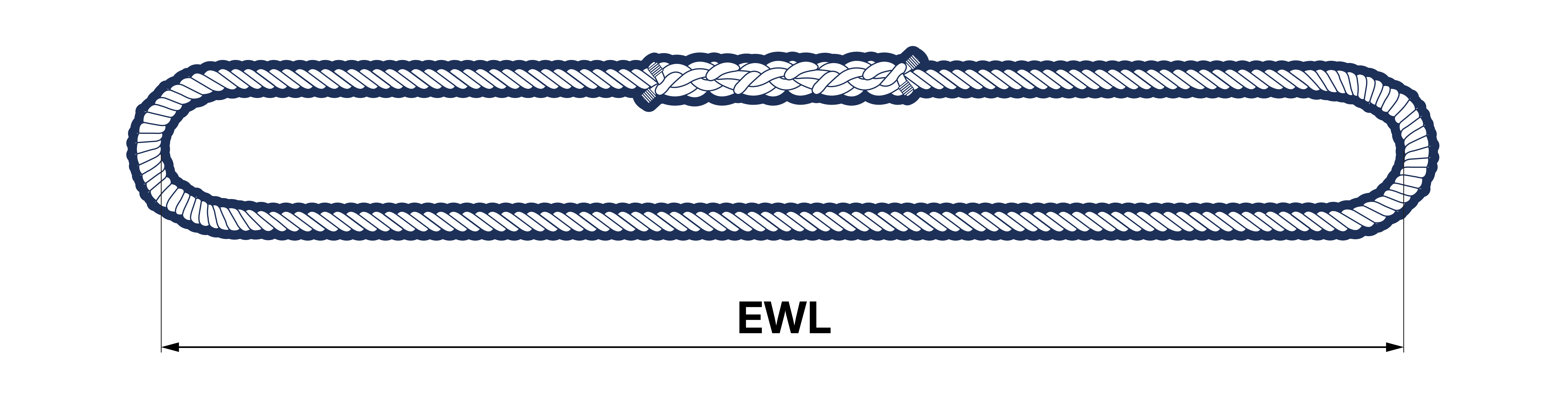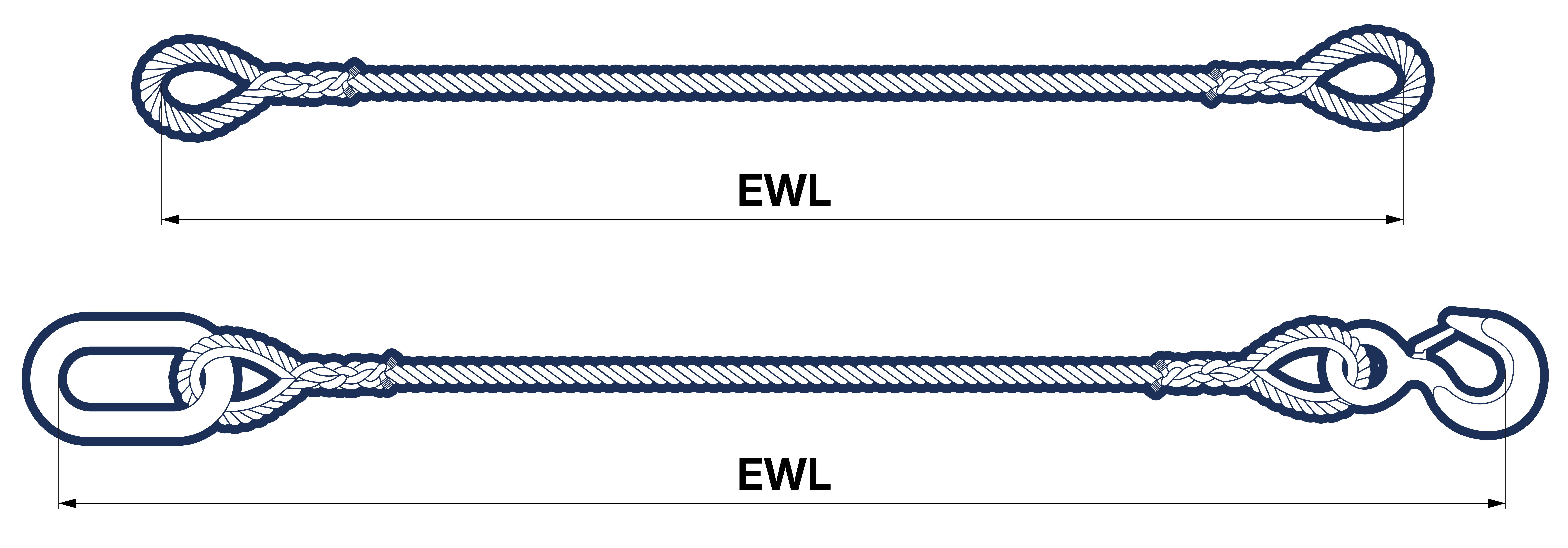 The effective working length (EWL) must be considered. This is measured between the bearing surface of the upper and lower terminals or, in the case of an endless sling, with the sling pulled flat, as shown in the following illustrations: