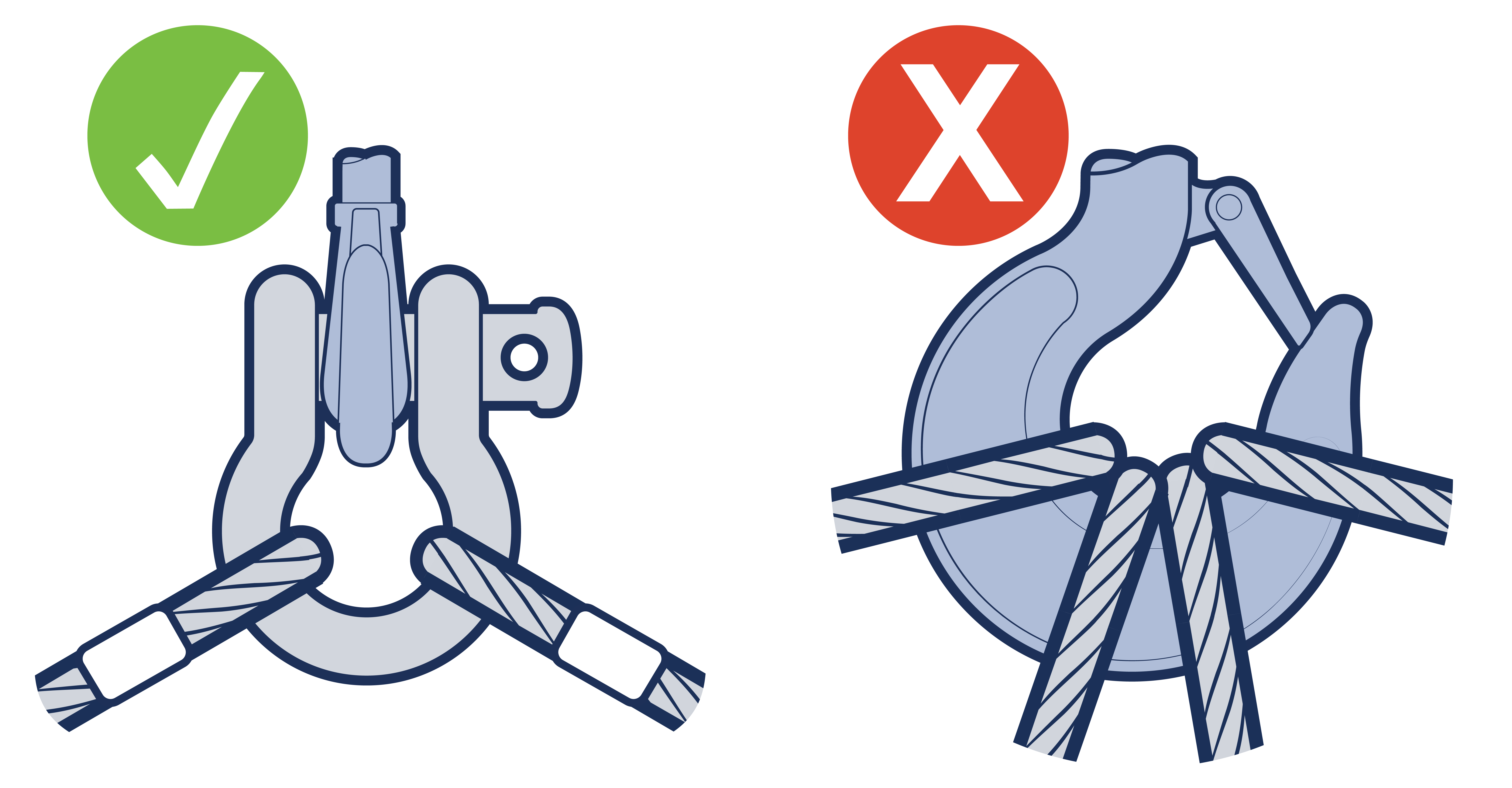 The bottom hook should not be crowded with the terminal fittings of slings. To prevent the hook becoming overcrowded, LEEA recommends that the upper end of the sling legs are connected by means of a shackle or link of adequate strength. (See Figure 4.11-3 )