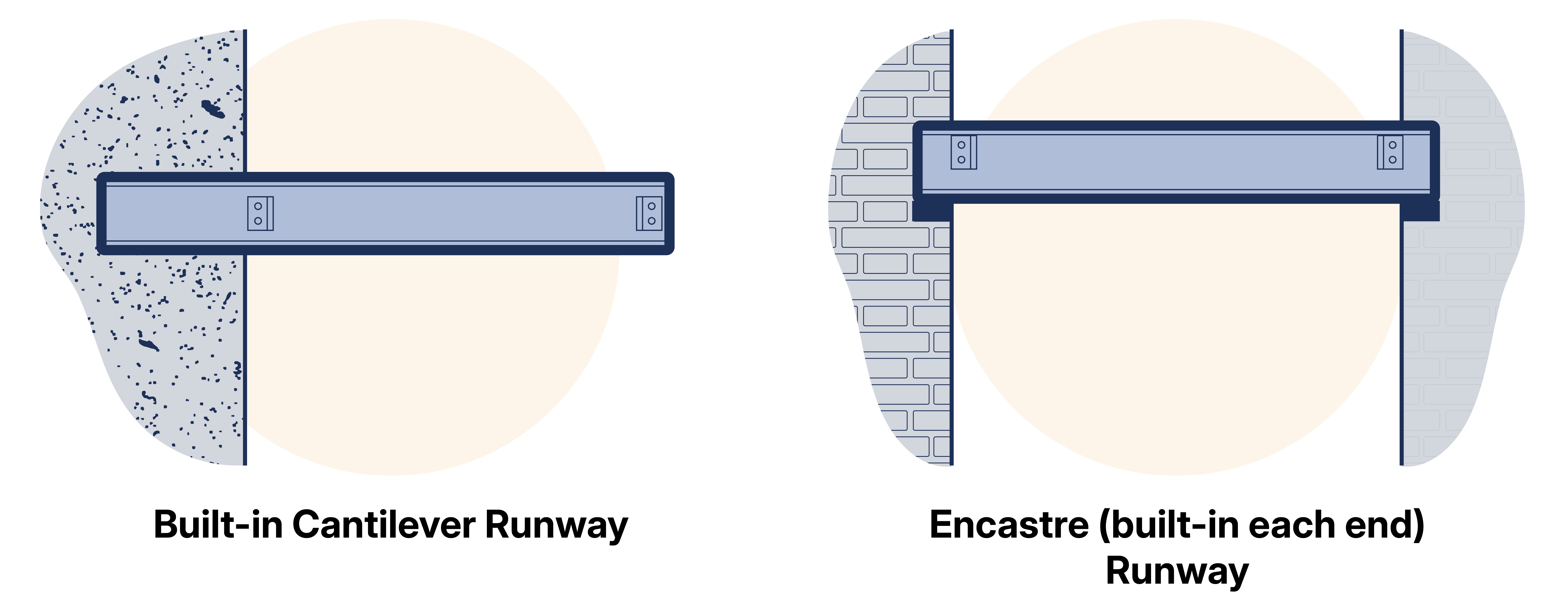 Runways may be built directly into suitable walls. Figure 11.4.1-1 a shows a cantilever runway built directly into a concrete structure. A runway, built into a brick structure, is shown in Figure 11.4.1-1 b, and is considered to be a simply supported beam. In this case, note the padstones distributing the resulting crushing loads imposed on the bricks at the bearing points.