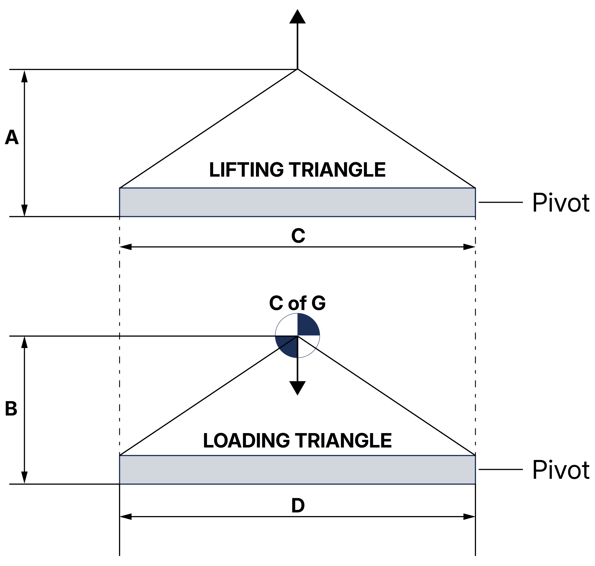 It should be noted that in the majority of cases, the use of a lifting beam instead of long slings will reduce the overall stability of the lift. Particular attention should be paid to the stability of the load when the lifting points are below the centre of gravity. Figure 21.5.2-1 shows the limiting condition for instability. To achieve a stable configuration, the height of the lifting triangle must be increased in relation to the loading triangle; i.e. for stability, ‘A’ must be greater than ‘B’ and ‘D’ must be equal to or greater than ‘C’.