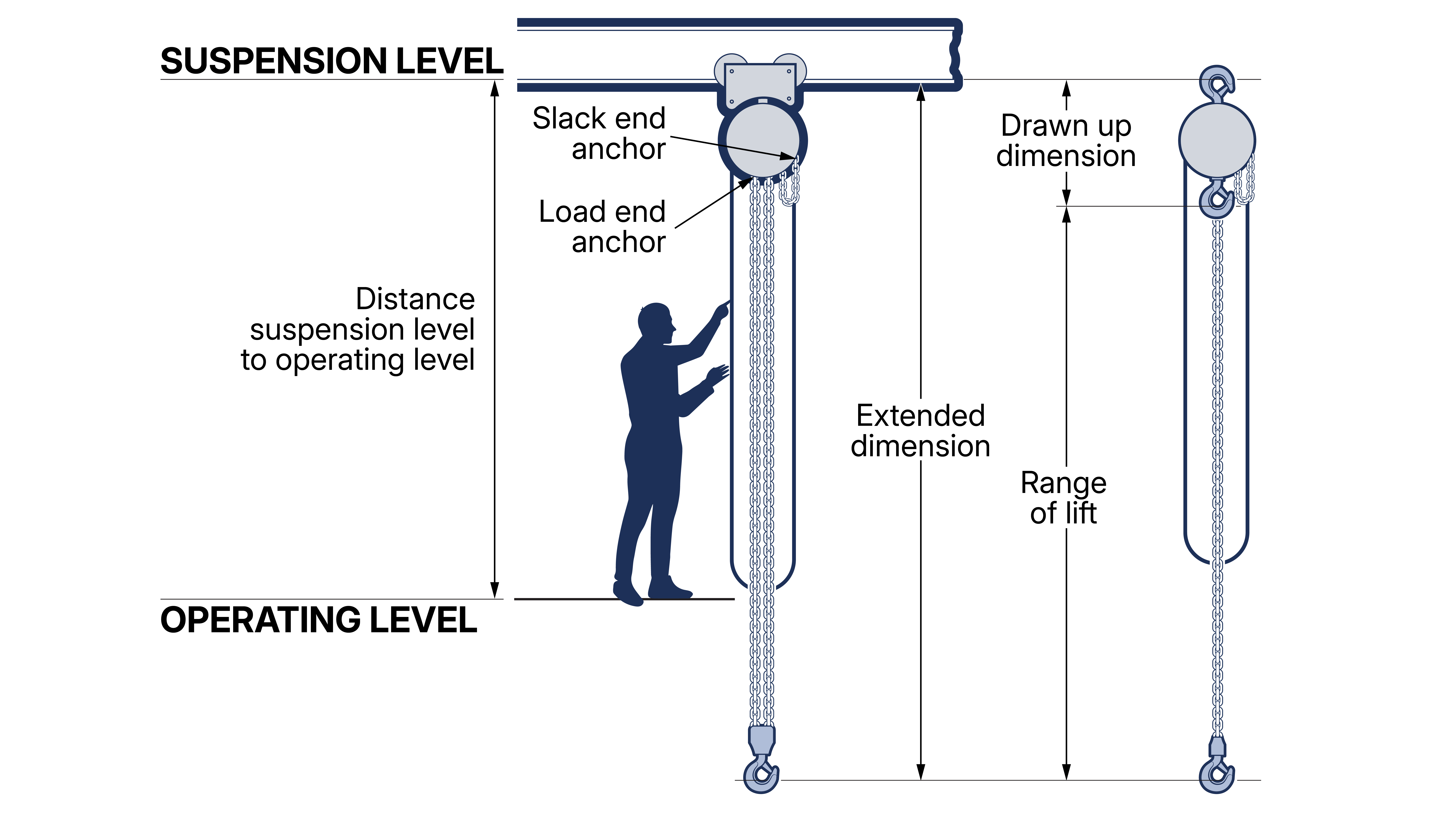 In the case of a hoist suspended from a hook, the suspension level is the level of the suspending hook saddle. In the case of a hoist combined with a trolley, it is the level of the surface upon which the trolley runs. In other cases, it is similar appropriate levels. (See Figure 3.3.1-1 )
