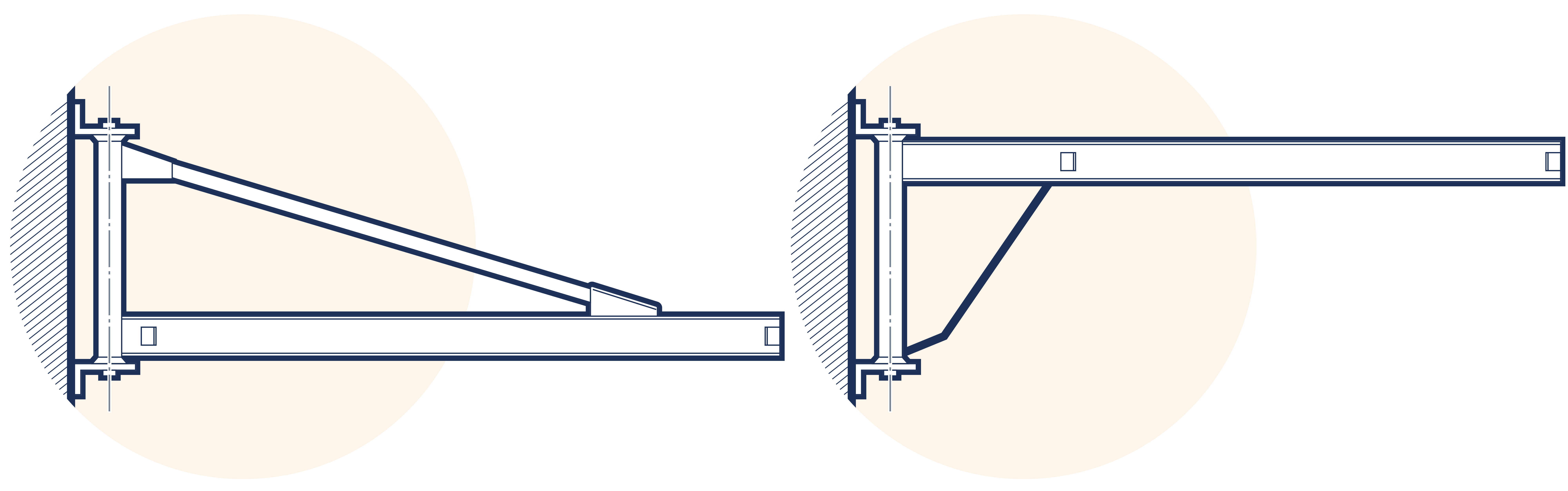 The angle of slew is limited dependent on the design of the bearing brackets and the supporting structure onto which they are erected. Wall mounted jibs are usually limited to 180° slew whereas a greater angle of slew may be obtained if the jib is column mounted. The angle of slew may be increased if the length of the bearing brackets is extended and can, in the case of column mounted jibs, be as great as 270°. Stops may be fitted to limit the angle of slew at any position within the arc of travel.