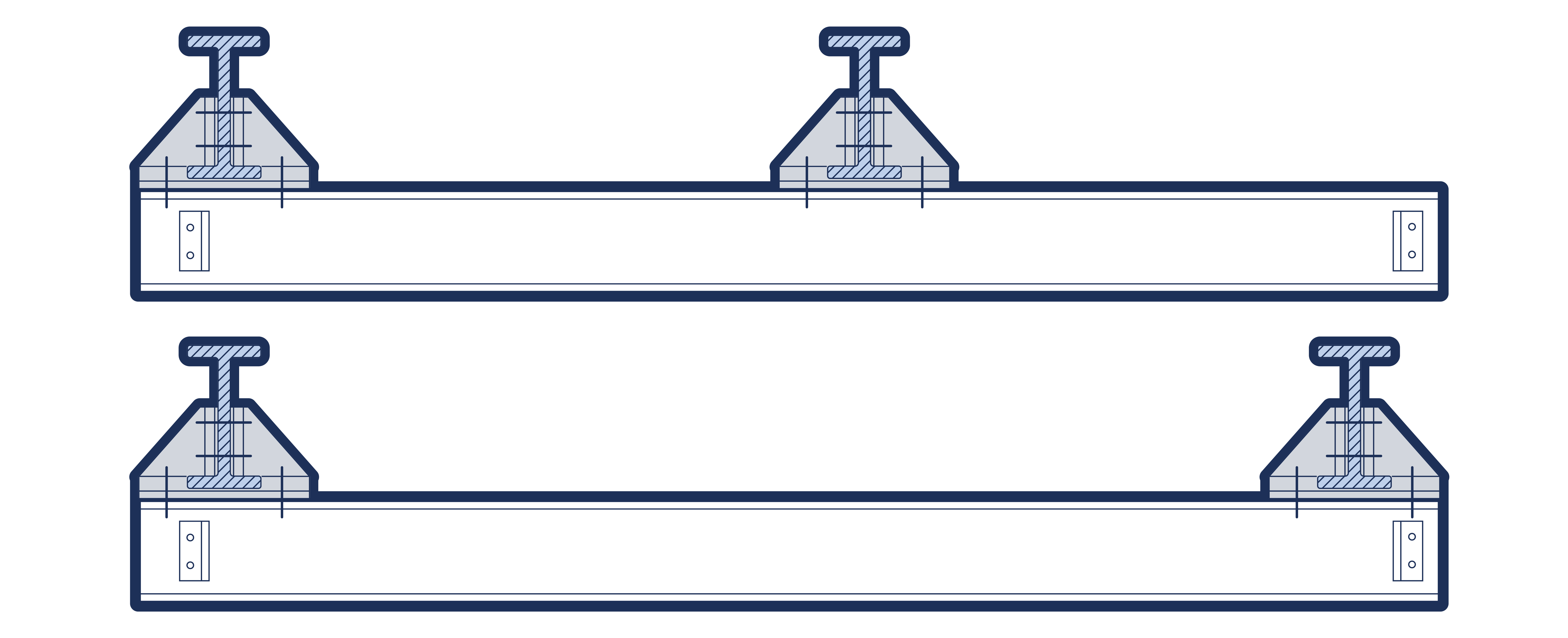 Runways are commonly suspended from suitable roof members or beams built into the building structure. Figure 11.4.3-1 shows a typical runway, with a cantilever section, suspended from roof beams and a runway supported each end.