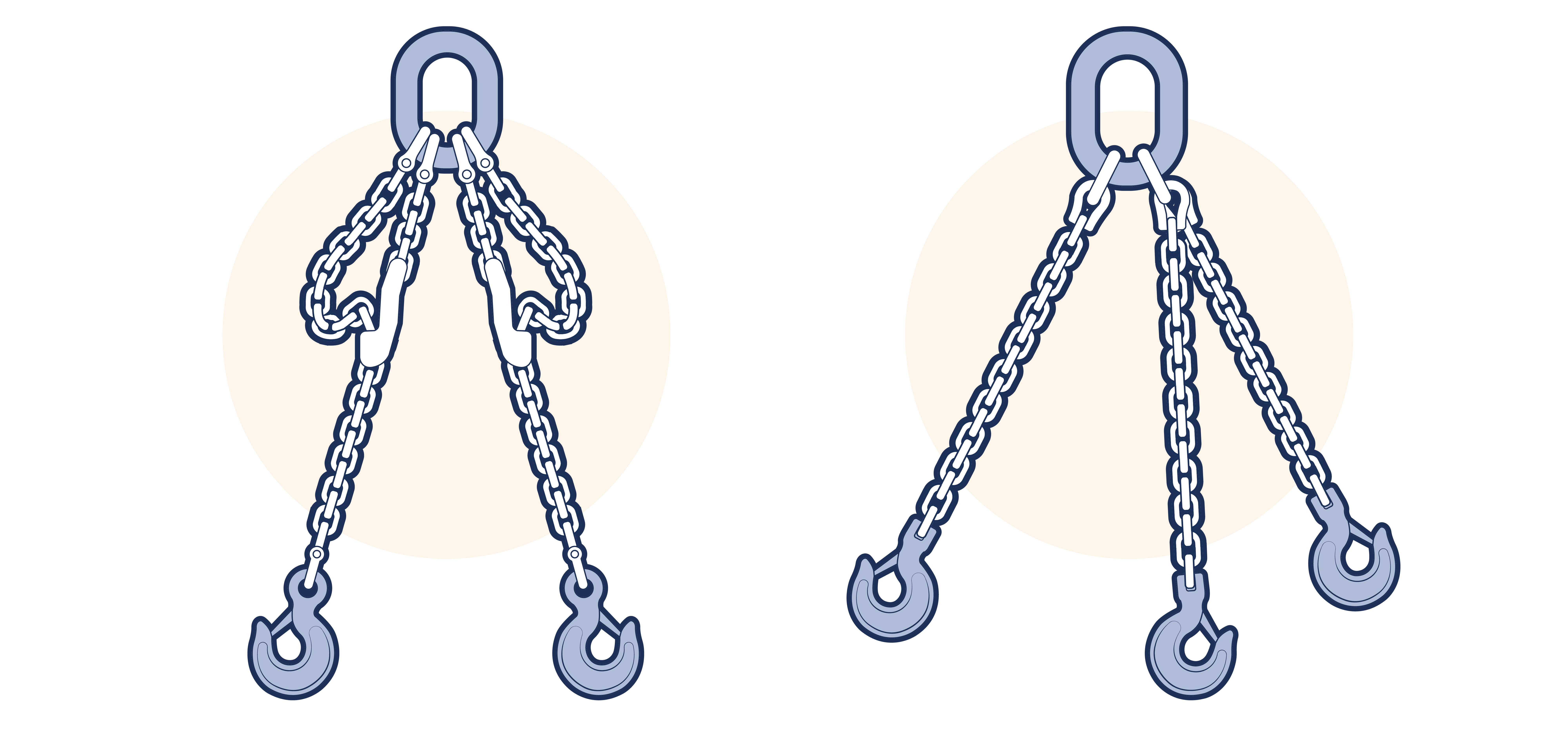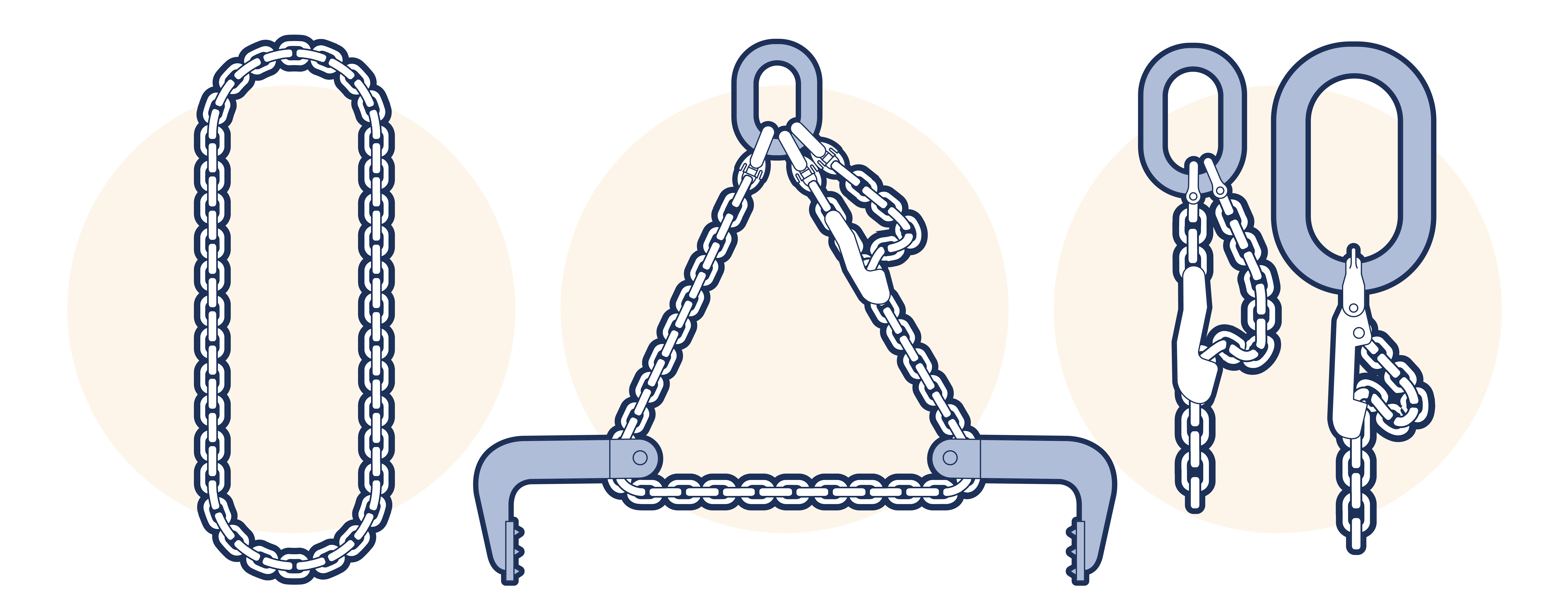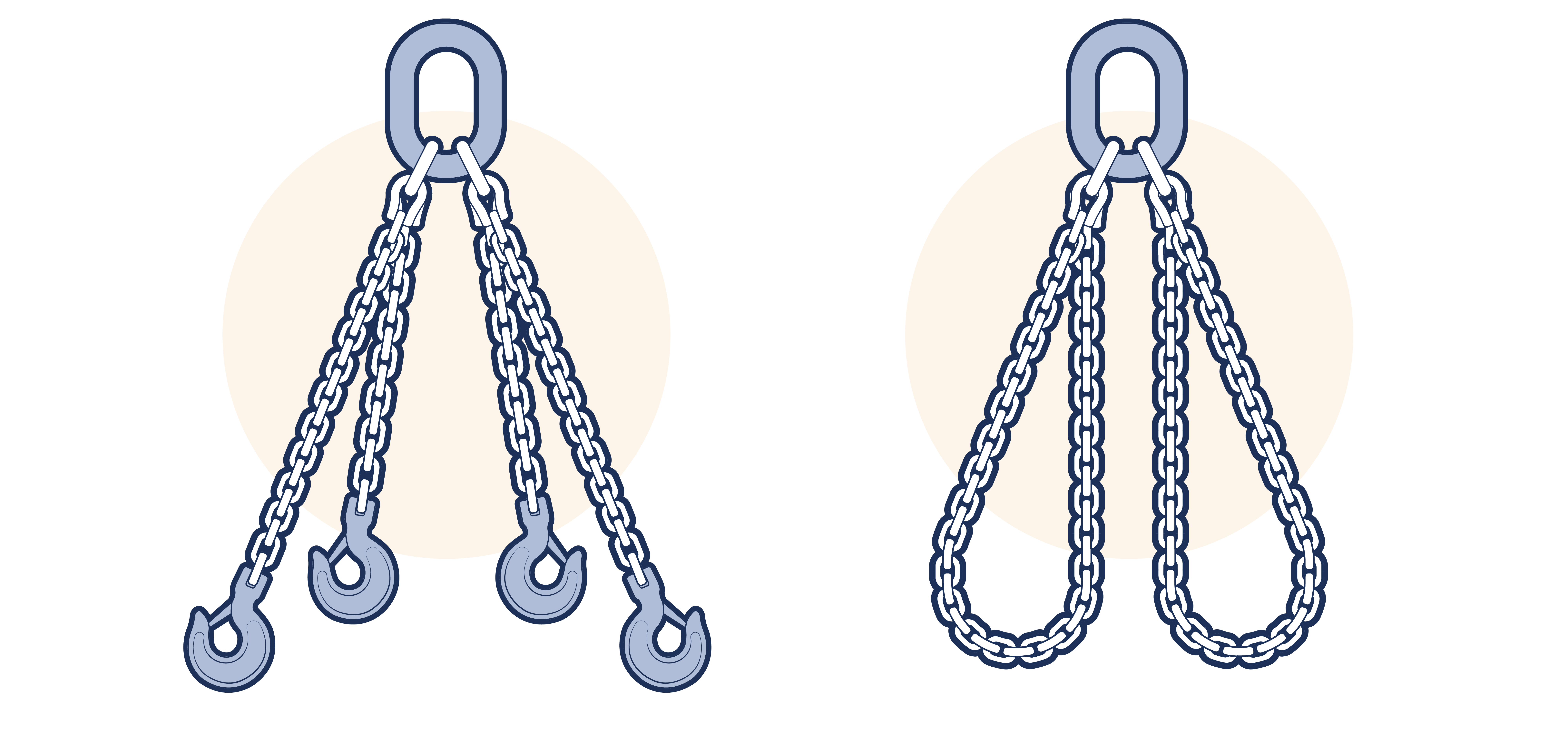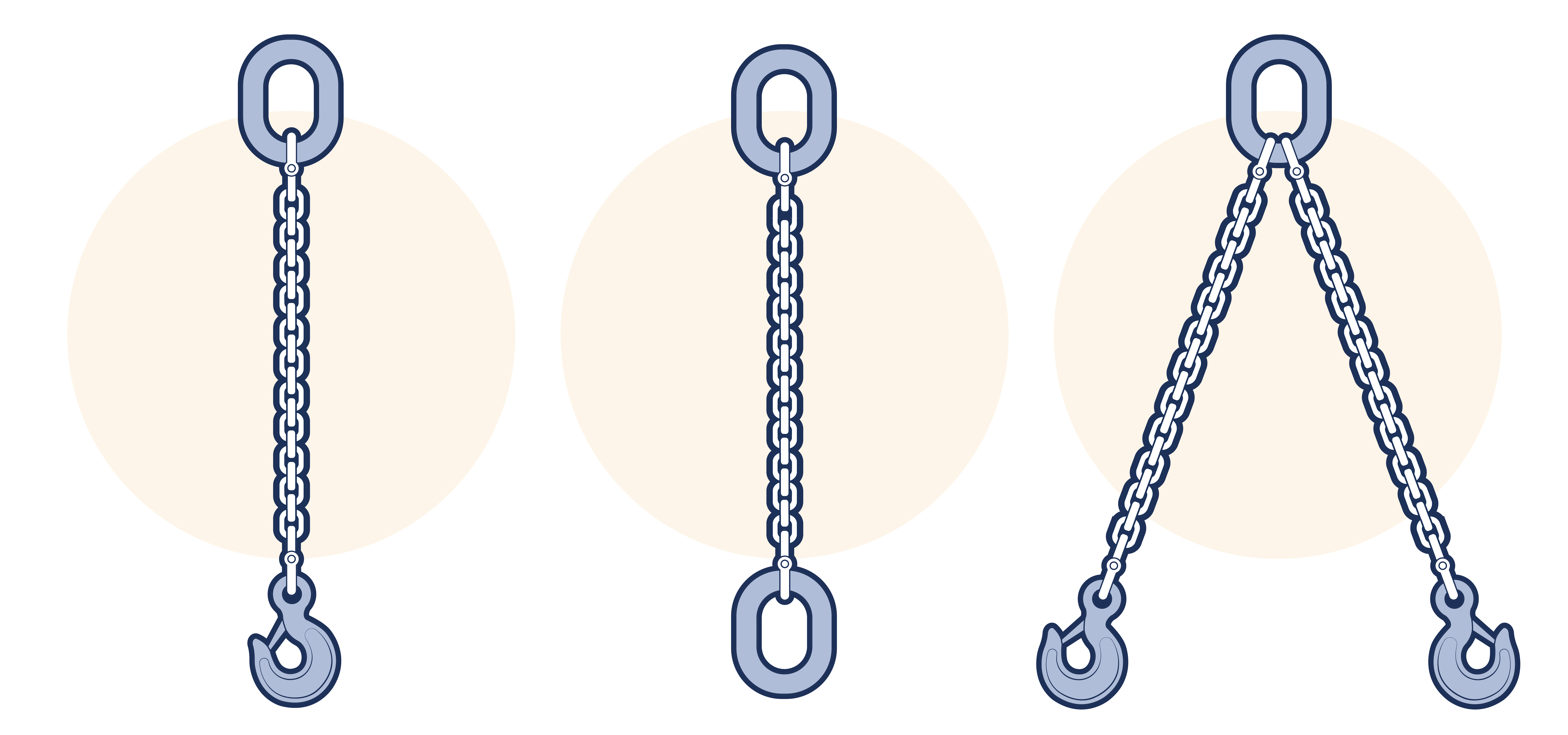 This subsection illustrates the most commonly used chain sling assemblies. Other special assemblies may be devised for lifting specific unusually shaped loads. Although the upper terminal fittings illustrated are links, rings were also permitted in some standards, but LEEA does not recommend their use.