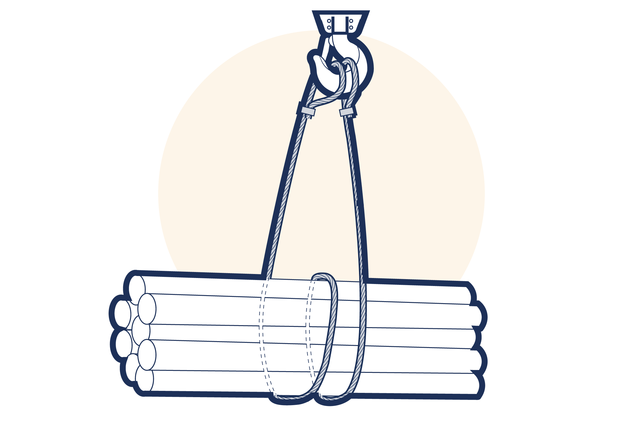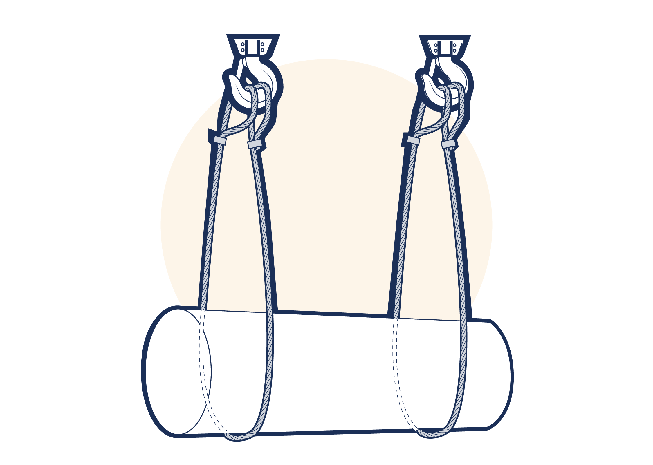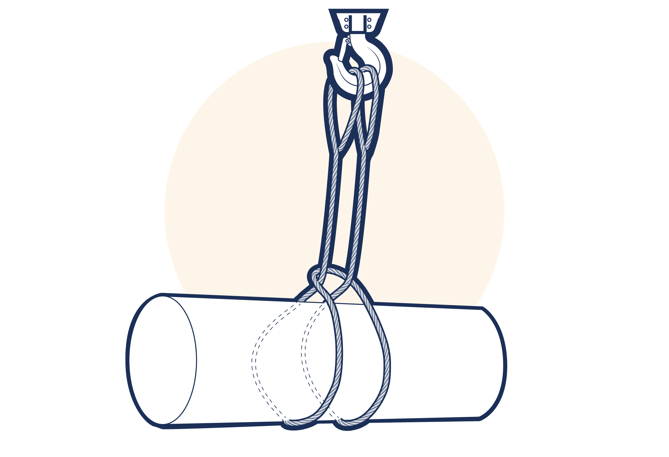 Double wrap choke hitch is a variation on choke hitch where the sling is passed one complete turn around the load before being choked. (See figure Figure 1.A5.5.4.3-1 ) This increases the binding effect and should be used on loose loads such as bundles of tubes. The sling should be de-rated by the same amount as for ordinary choke hitch.