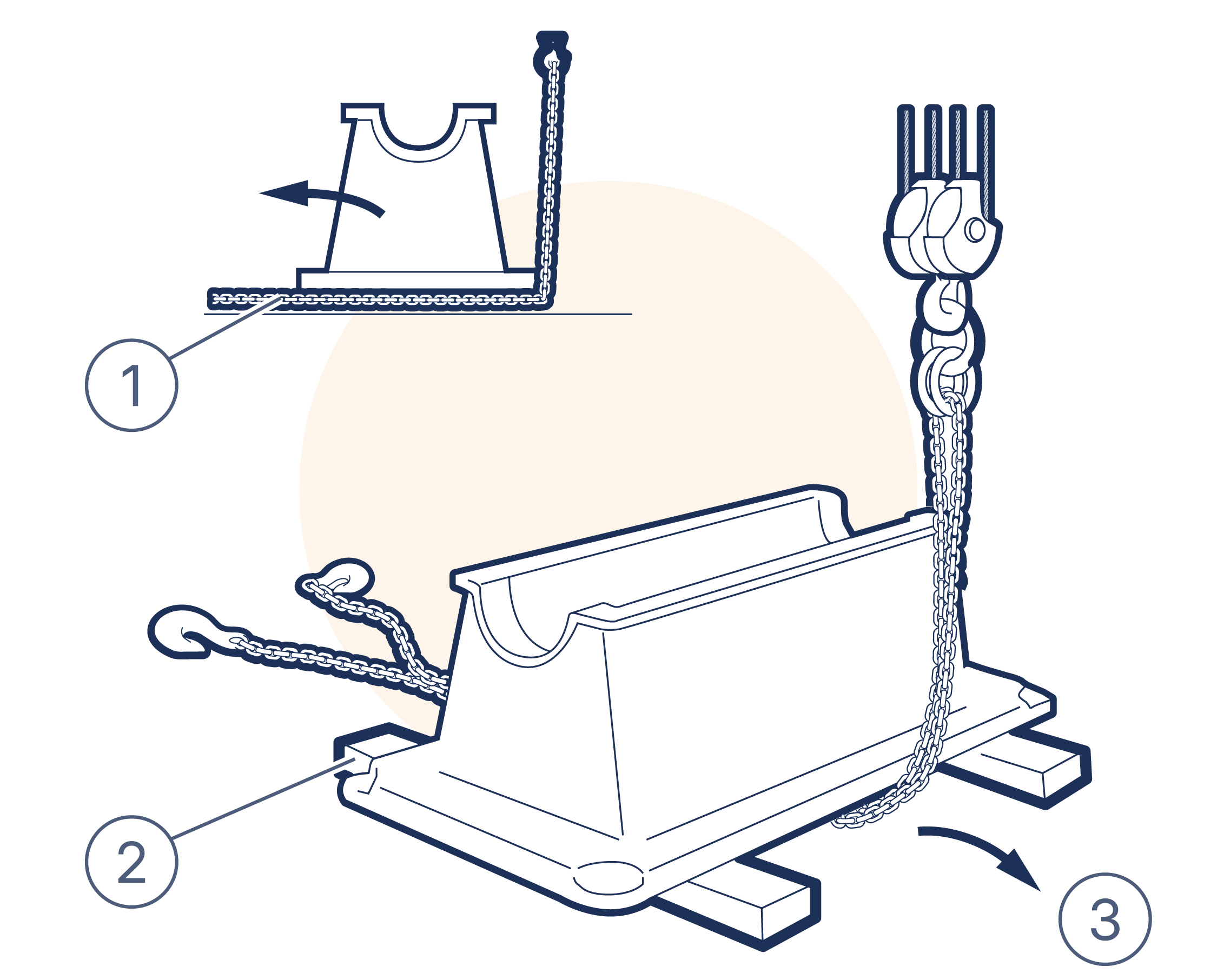 A suitable setting down area should be selected before lifting. When lowering, a trial set down should be made before the slings are released. Make sure that the load is placed on battens, dunnage or packing so that the slings can be readily withdrawn. Trapped slings should never be dragged out from under a load, nor should slings be used to drag a load. (See Figure 1.A5.5.5.4-2 )