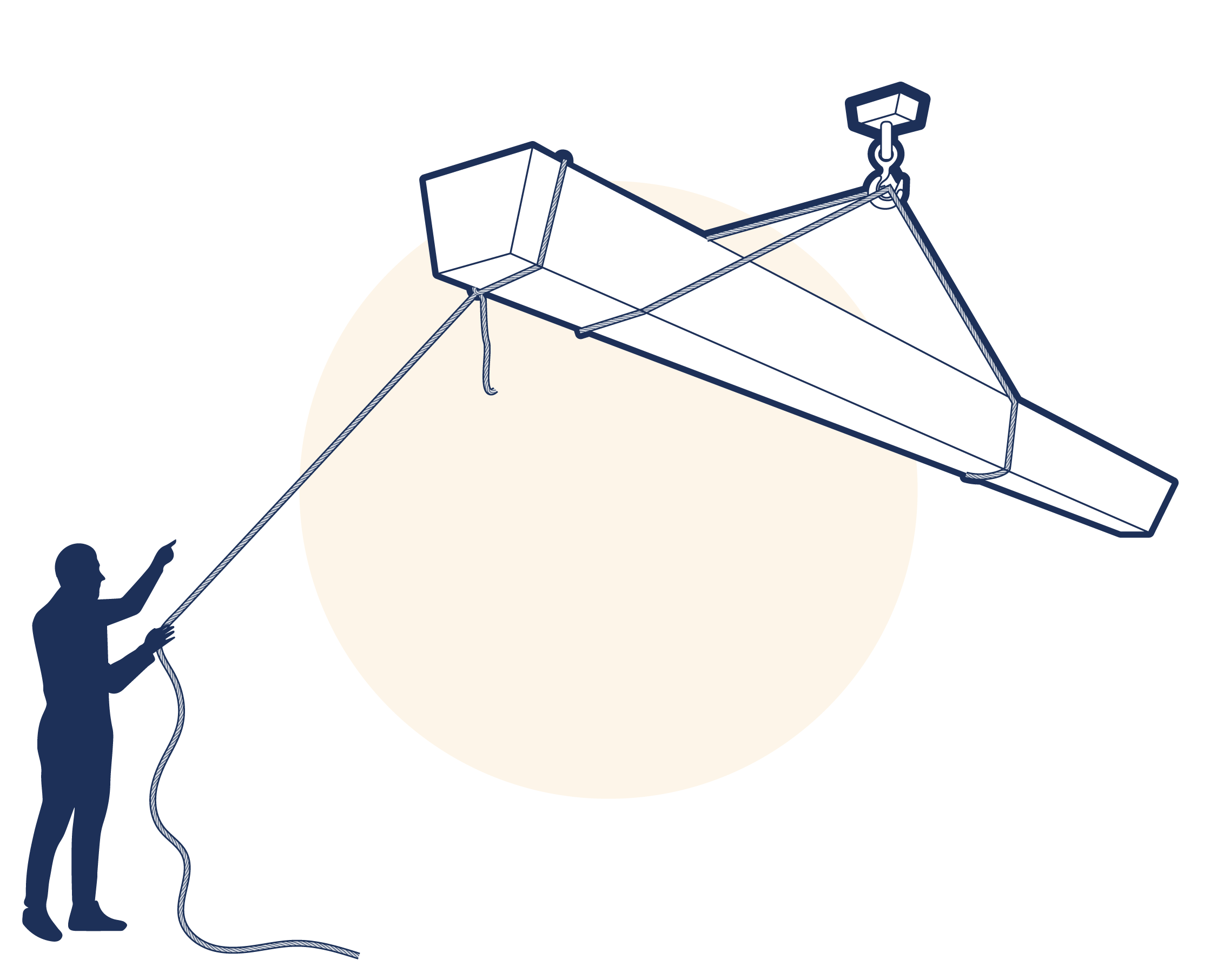 Traditionally tag lines have been used to help to control long or bulky loads (See figure Figure 1.A5.5.5.4-1 ). The slinger should always ensure that everyone is clear before commencing the lift. It must be noted however that their use must be carefully considered at the planning stage as there are potentially hazards associated with their use such as, when using polypropylene or fibre ropes