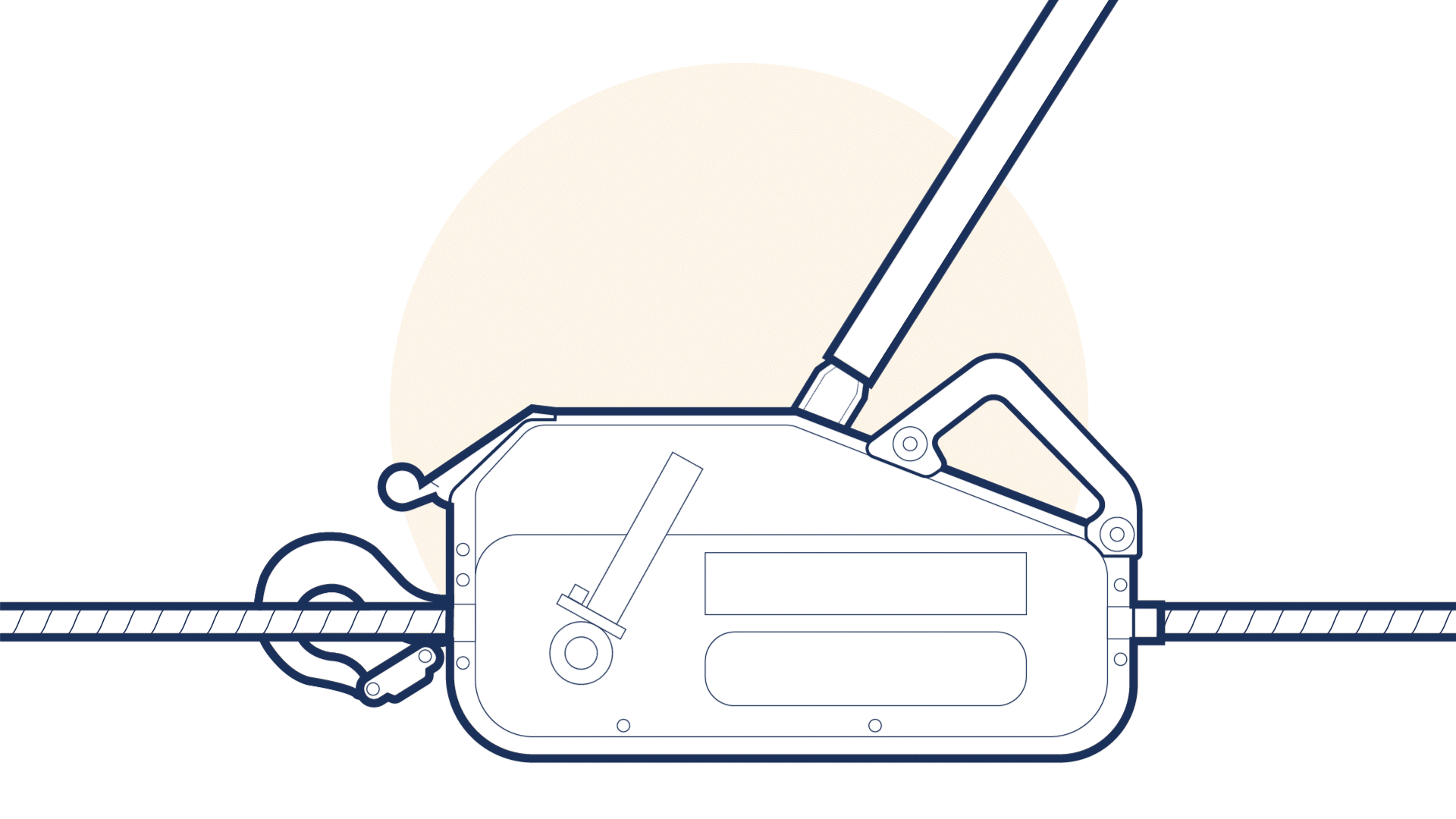 In manually operated machines (Figure 5.4.1-1 ) a hand operated lever activates a mechanism to provide a direct pull on an integral rope which is attached to the load. The pull is applied by means of two pairs of self-energising jaws, which exert a grip on the rope, the distance of travel being limited only by the length of the rope. The initial pressure which causes the jaw to grip the rope and give the self-energising action is provided by powerful springs.