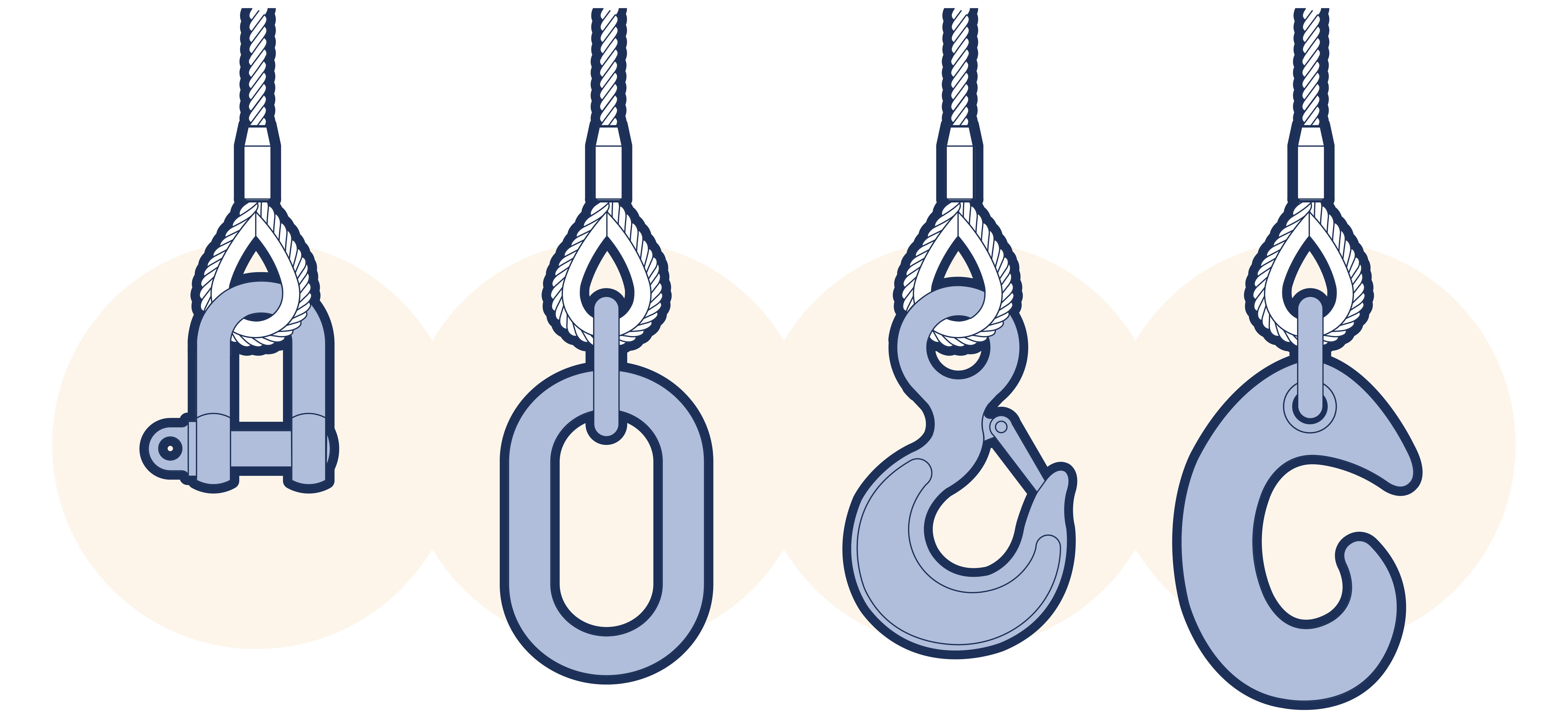 A range of lower terminal fittings may be used with wire rope slings, the most common are illustrated in Figure 15.4.2-1 .