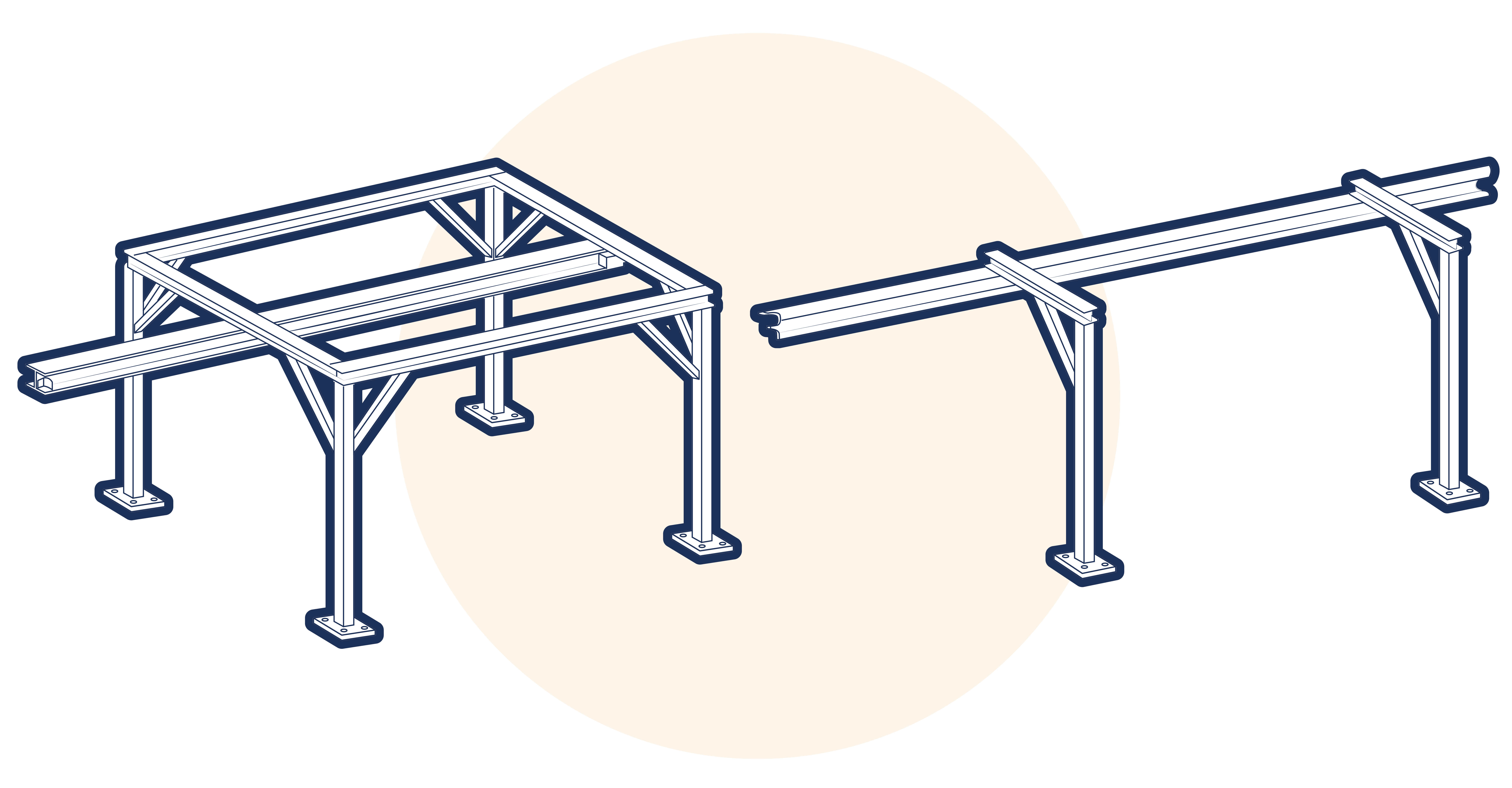 Where runways are used in locations that do not provide suitable supporting structures, free standing runway structures are common. Supporting structures may vary to suit the application and location of the runway. Figure 11.4.2-1 shows two typical free standing runway structures, suitably braced to withstand the dynamic loading and imposing the resultant loads through the column bases only.