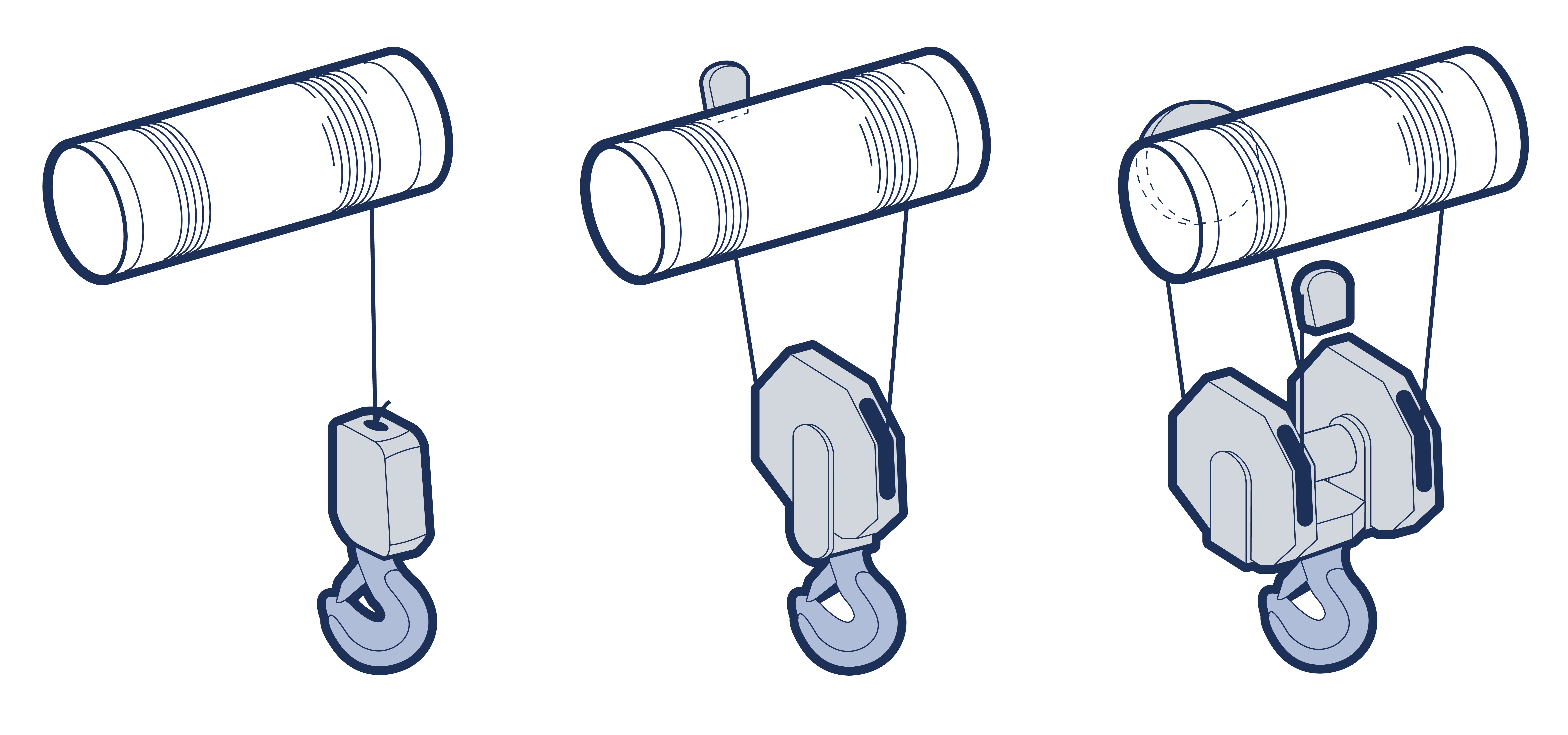 In addition to the size of the chain or wire rope used, the capacity of the hoist is governed by the number of falls that support the load. A large proportion of hoists are manufactured with multiple falls. The same basic power unit may therefore be used for two or three capacities of hoist, e.g. 1 tonne single fall, 2 tonne with two falls or 4 tonnes with four falls. (See Figure 6.4.7-1 )