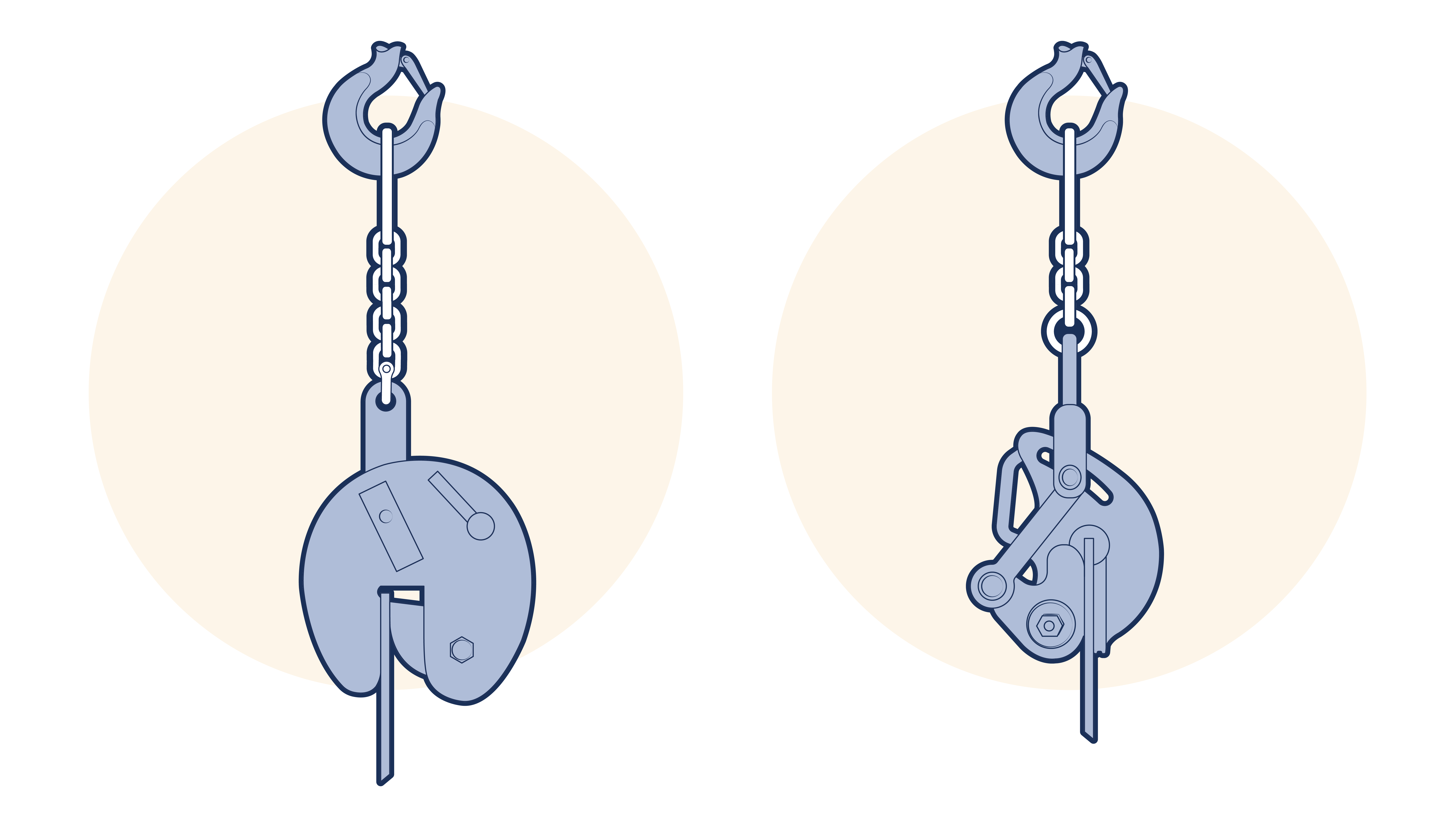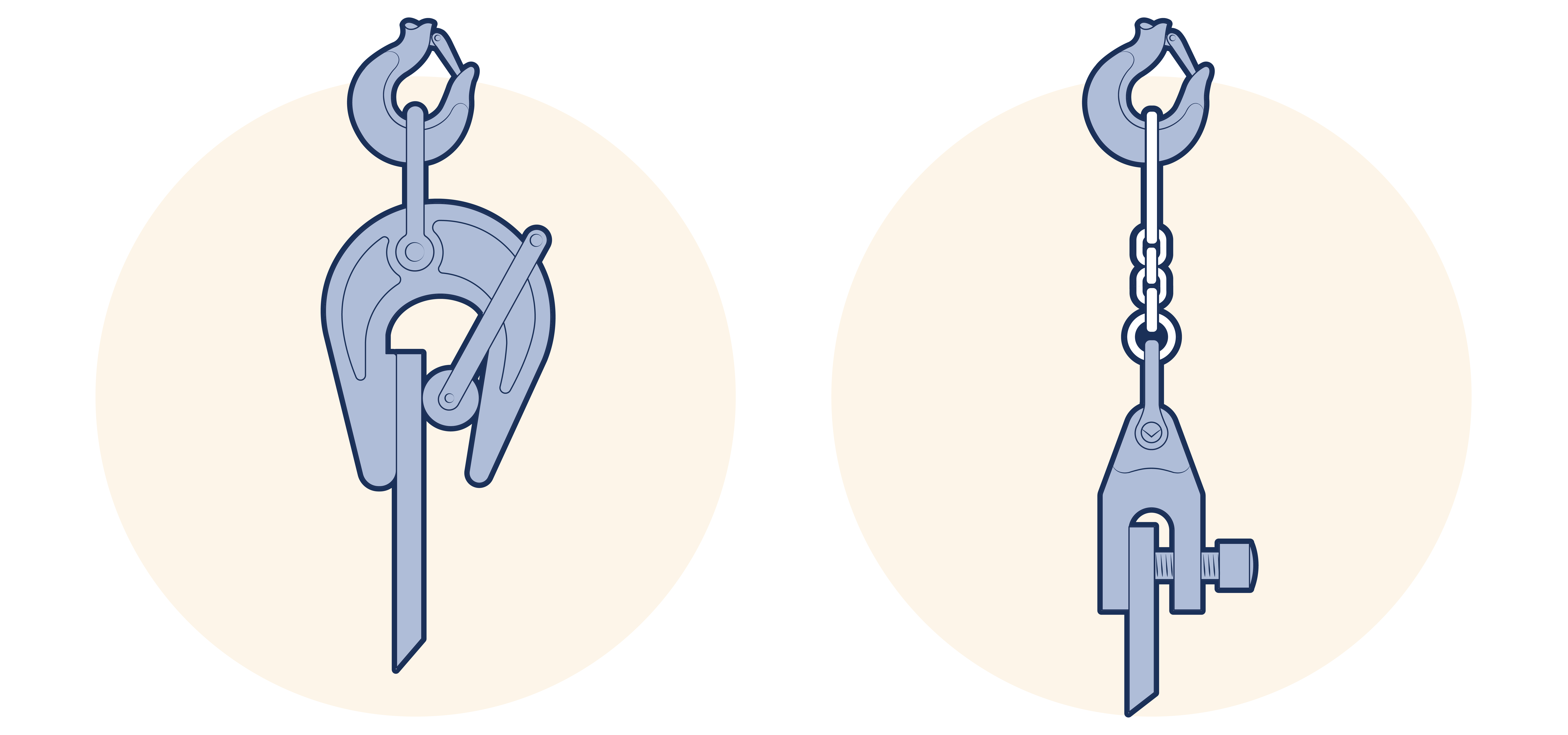 Those in which a system of levers actuated by the loading of the lifting eye or chain, or in which a chain or wire rope is attached to the jaws in such a way as to produce a force causing the jaws to come together and grip the plate. (See Figure 22.4.1-1 ) Such gripping action may be provided by the lever system itself, or by a combination of the leverage and the cam action of the jaw. Clamps which are provided with a spring loaded locking device which secures (locks) the clamp onto the plate without a force being applied to the lifting eye are preferred. Some clamps are capable of lifting plates from the horizontal to the vertical and vice versa but some will only maintain their grip away from the vertical one way around and so can only be used to turn a plate over if the plate is first lifted to the vertical, then temporarily supported whilst the clamp is removed and turned around prior to the plate being lowered. Those which retain their grip throughout the whole manoeuvre are preferred and users are reminded of their obligations to provide safe systems of work. It is unlikely that such equipment will meet these requirements. In addition some clamps have the further advantage of being able to accommodate a lifting load applied at any angle to the side plate of the clamp. The working load limit of such clamps is usually reduced by a stated percentage (e.g. 50%) when so used. Confirmation should be sought from the manufacturer’s instructions on the performance of their clamps.