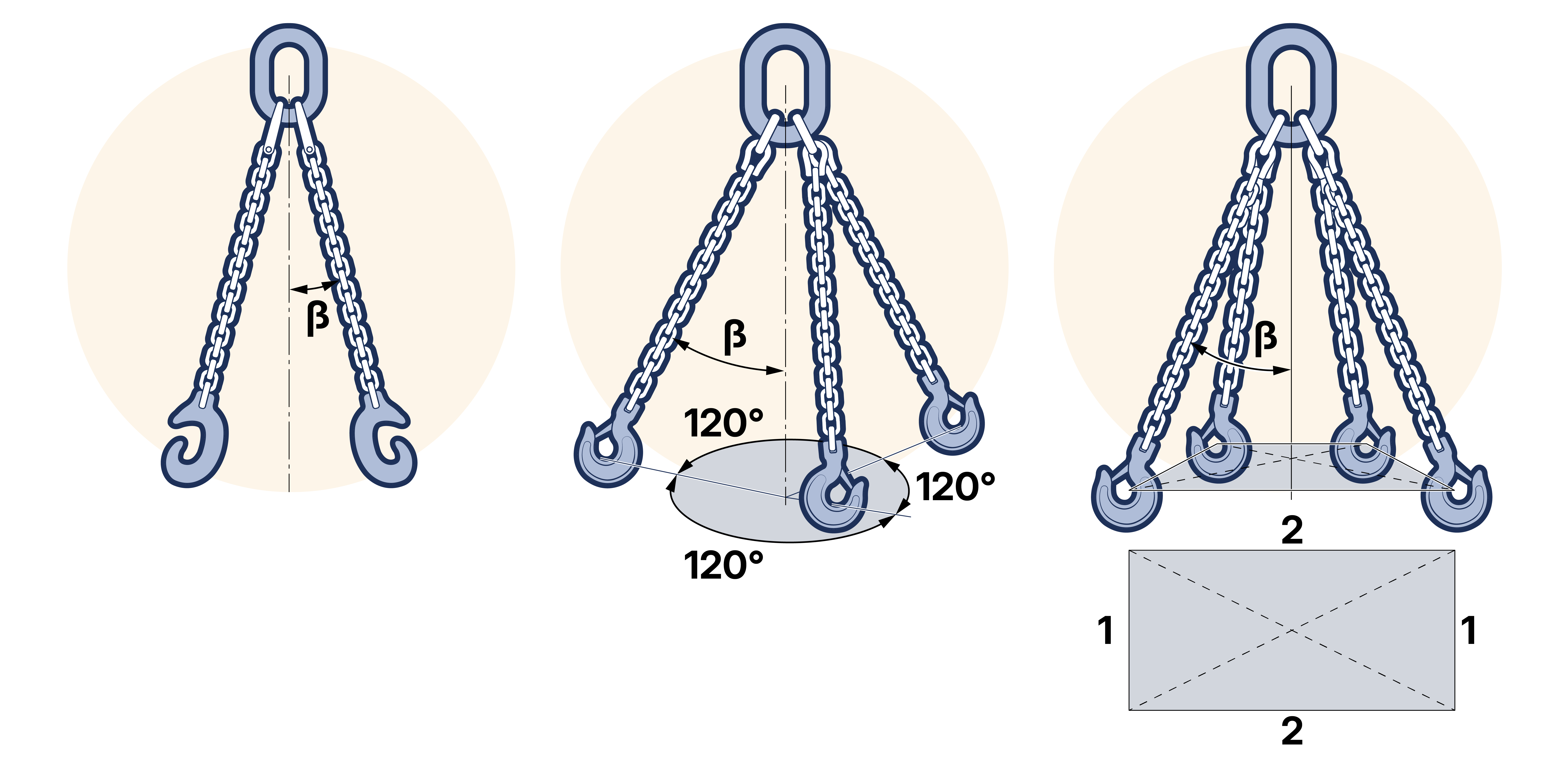 The geometry of the sling: i.e. the number of chain legs and, in the case of multi-leg slings, the angle of the legs to the vertical and the disposition of the legs in plan. Angles should be assessed as shown in figures 14.13 to 14.15 inclusive. The angle to the vertical = β (‘included angle’ = 2β).